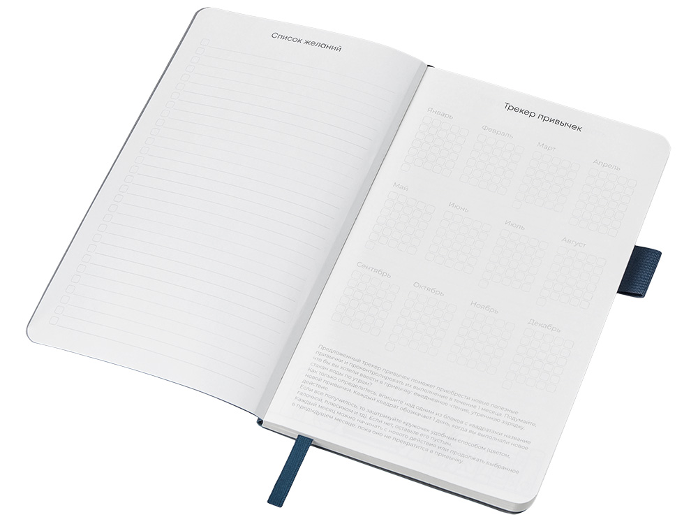 Необычный для блокнота вводный блок включает трекер привычек, списки книг и фильмов, а также 4 страницы для раскрашивания с картинками и мандалами.