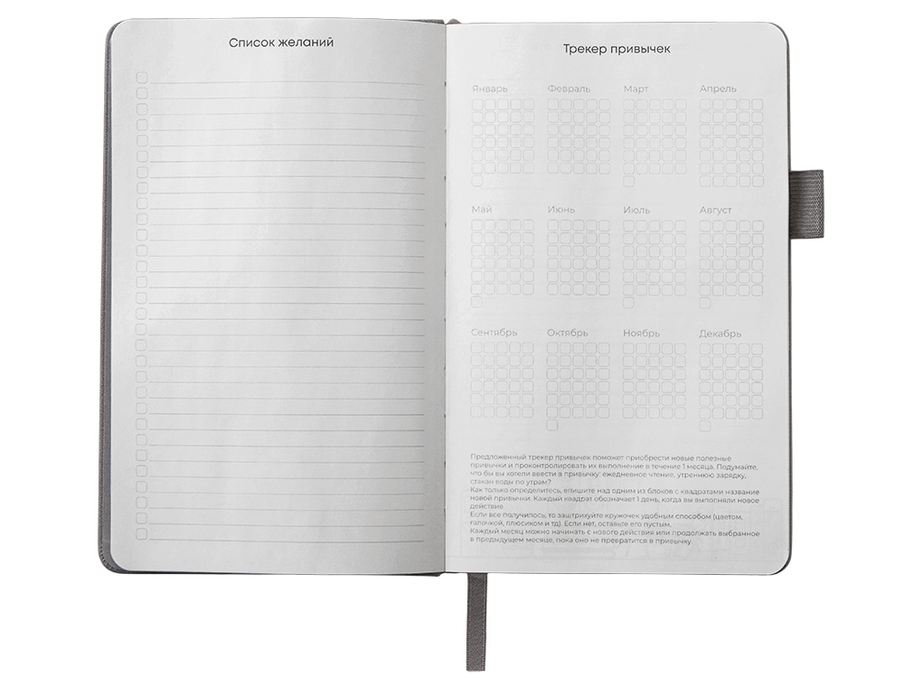 Необычный для блокнота вводный блок включает трекер привычек, списки книг и фильмов, а также 4 страницы для раскрашивания с картинками и мандалами.