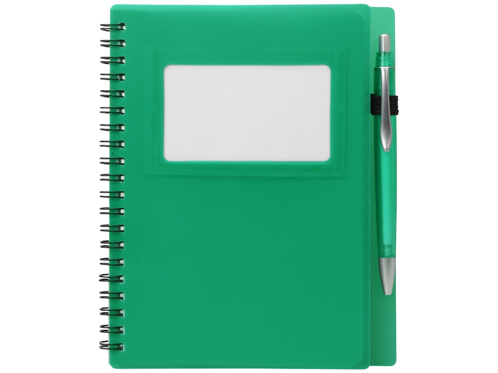 Блокнот Контакт в полипропиленовой обложке переплетен на пружине. В обложке блокнота предусмотрено окошко, в которое можно поместить визитную карточку или полиграфическую вставку. В комплекте с блокнотом идет ручка, которая вставляется в петельку сбоку.