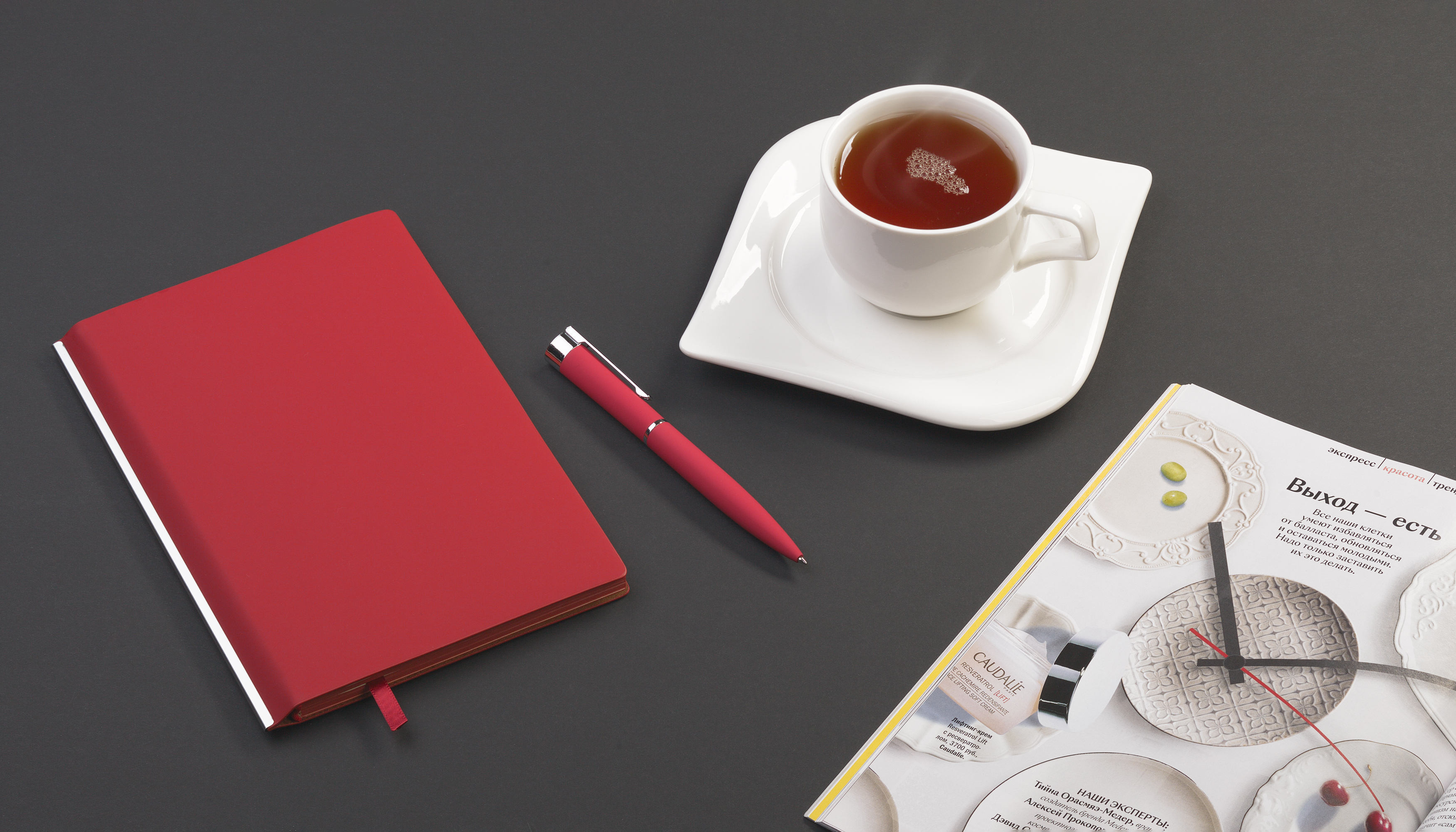 Главной особенностью дизайна блокнота является гибкая «трогательная» soft touch обложка, а также металлический корешок и срез блока в цвет обложки. Удобный А5 формат, компактный размер и лента-ляссе дополняют образ.