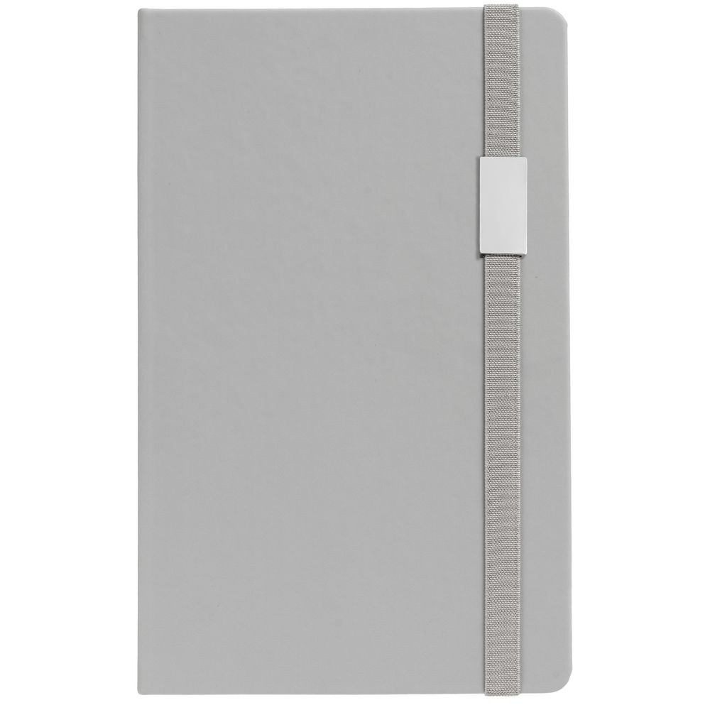 Блокнот в твердой обложке, выполнен из материала Soft Touch, серый СС, дополнен резинкой и ляссе в цвет обложки.