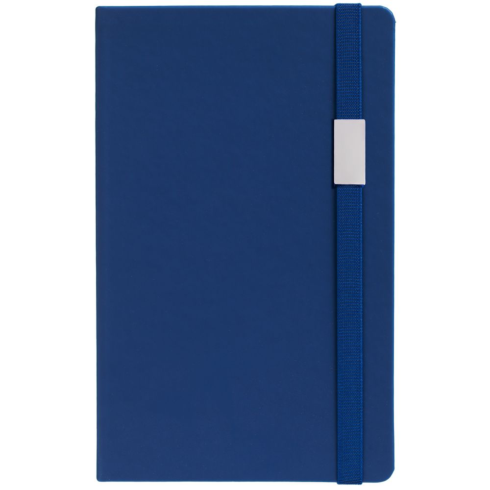 Блокнот в твердой обложке, выполнен из материала Soft Touch Pearl, синий НН, дополнен резинкой и ляссе в цвет обложки.