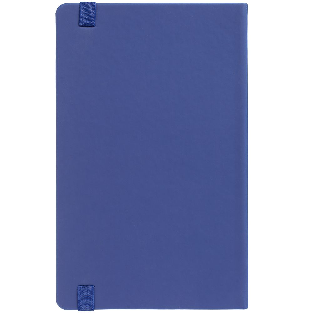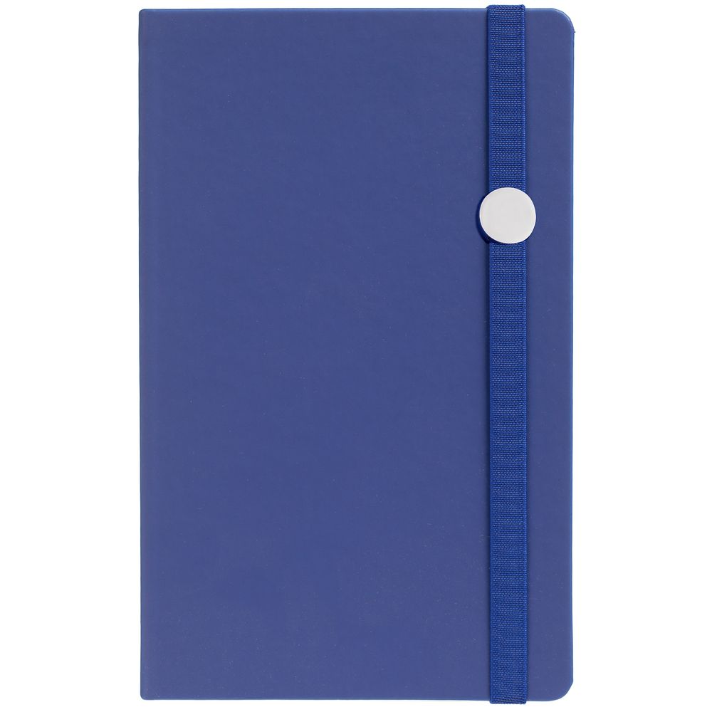 Блокнот в твердой обложке, выполнен из материала Soft Touch Pearl, синий НН, дополнен резинкой и ляссе в цвет обложки.