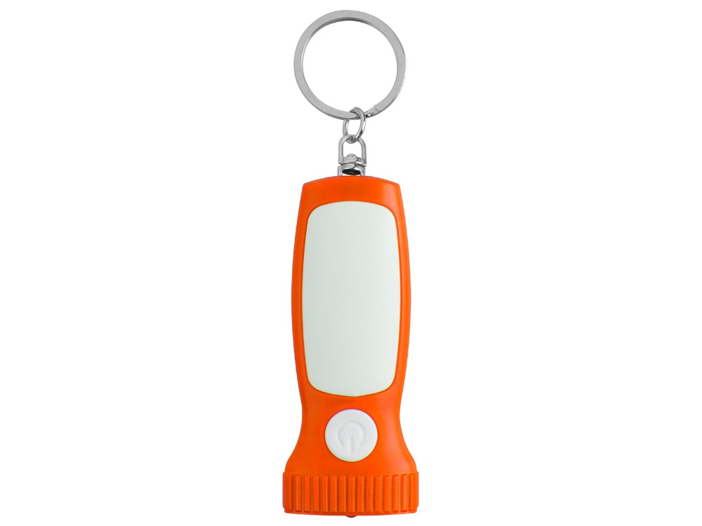 Яркий брелок со встроенным фонариком. Плоская форма и большая ручка с белой вставкой делает брелок удобным для нанесения логотипа. -