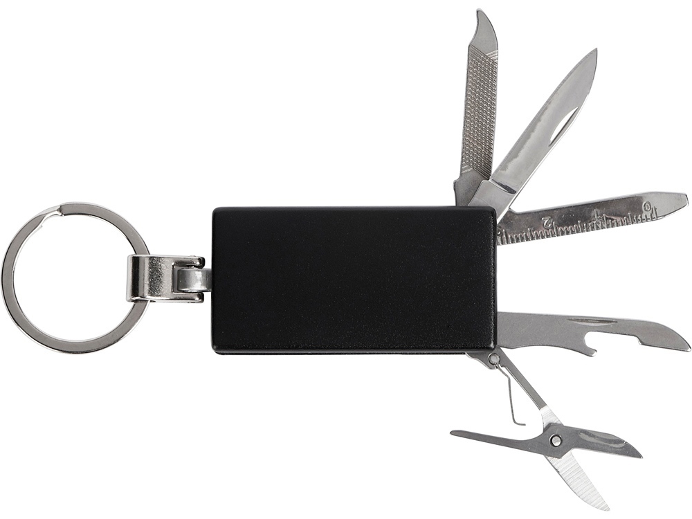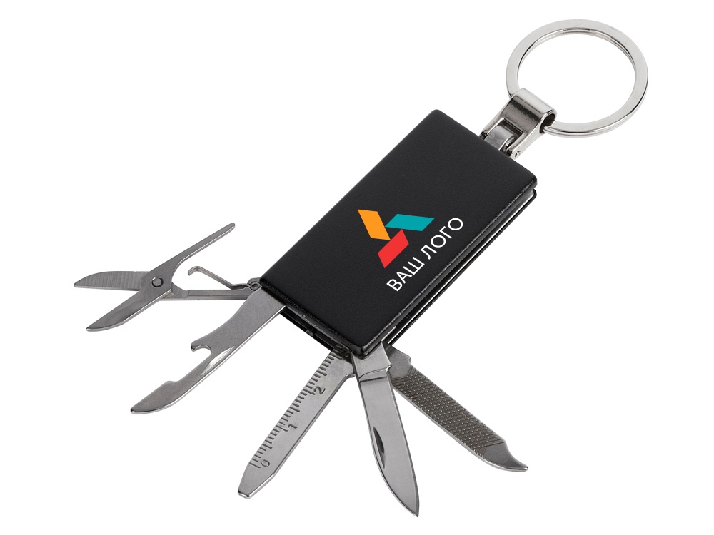 Брелок-мультитул на кольце в металлическом корпусе с заметным полем под нанесение.