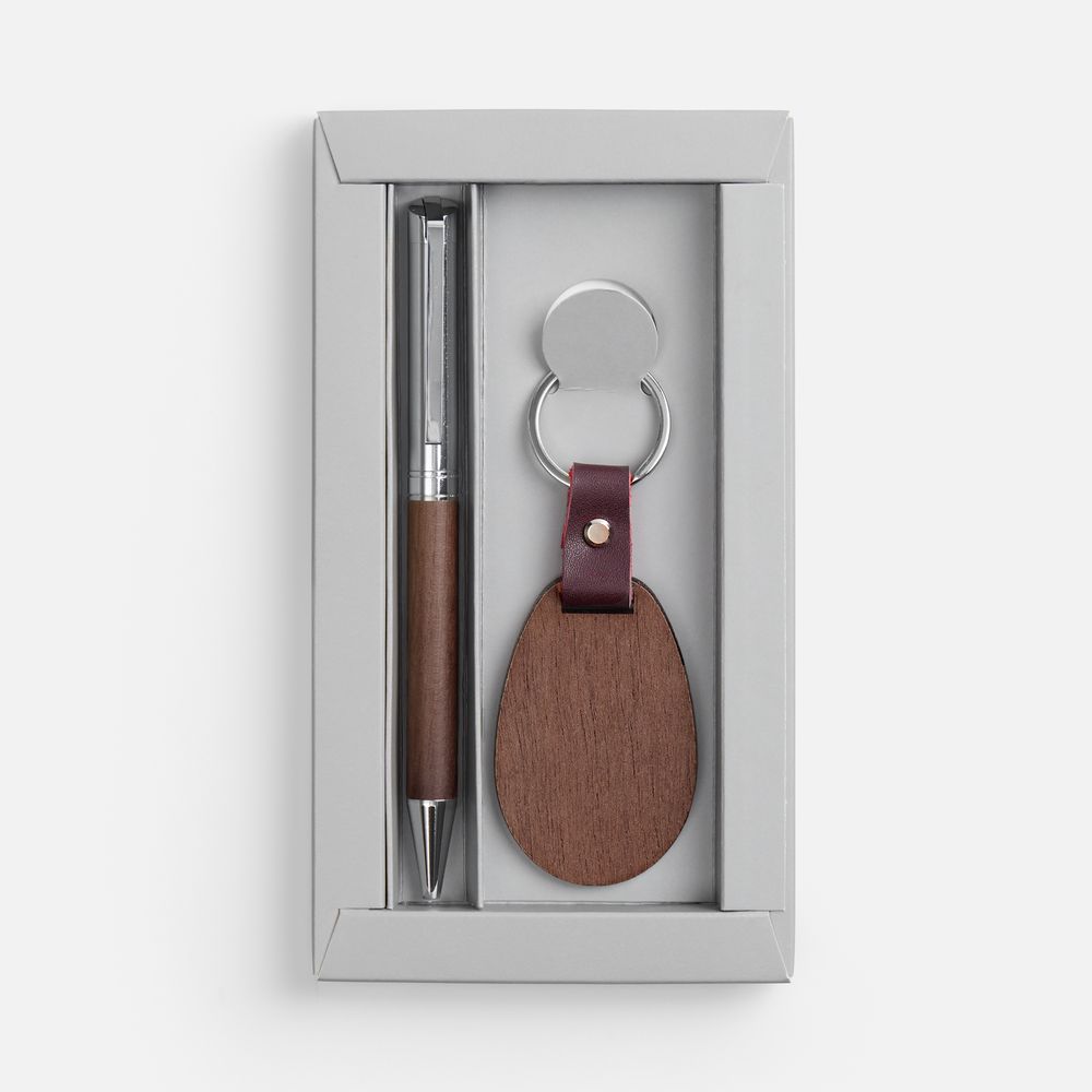 Шариковая ручка в деревянном корпусе и брелок из красного дерева в элегантном подарочном дуэте. -