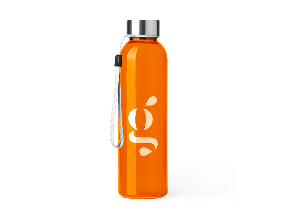 Стеклянная бутылка емкостью 500 мл. Большое разнообразие цветов, с завинчивающейся крышкой из нержавеющей стали и удобной для транспортировки благодаря ремешку серого цвета. -