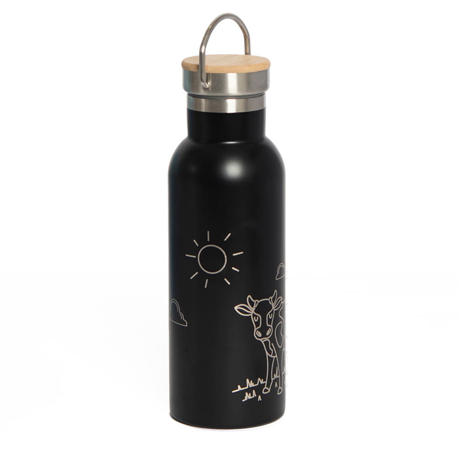 Бутылка для воды с двойными стенками из нержавеющей стали.Держатель на крышке для удобства переноски.Верхняя часть крышки из бамбука, отлично подходит для персонализацииБлагодаря двойным стенкам, температура напитка в бутылке будет в полной сохранности на протяжении 2-3 часов.Индивидуальная упаковка - коробка из крафтового картона -