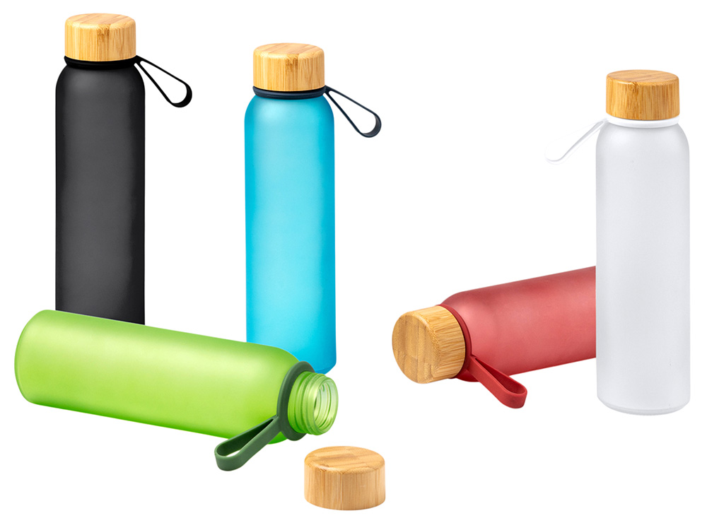 Полупрозрачная бутылка из переработанного стекла. Бамбуковая крышка с держателем. Объём: 500 мл. Поставляется в индивидуальной коробке. -