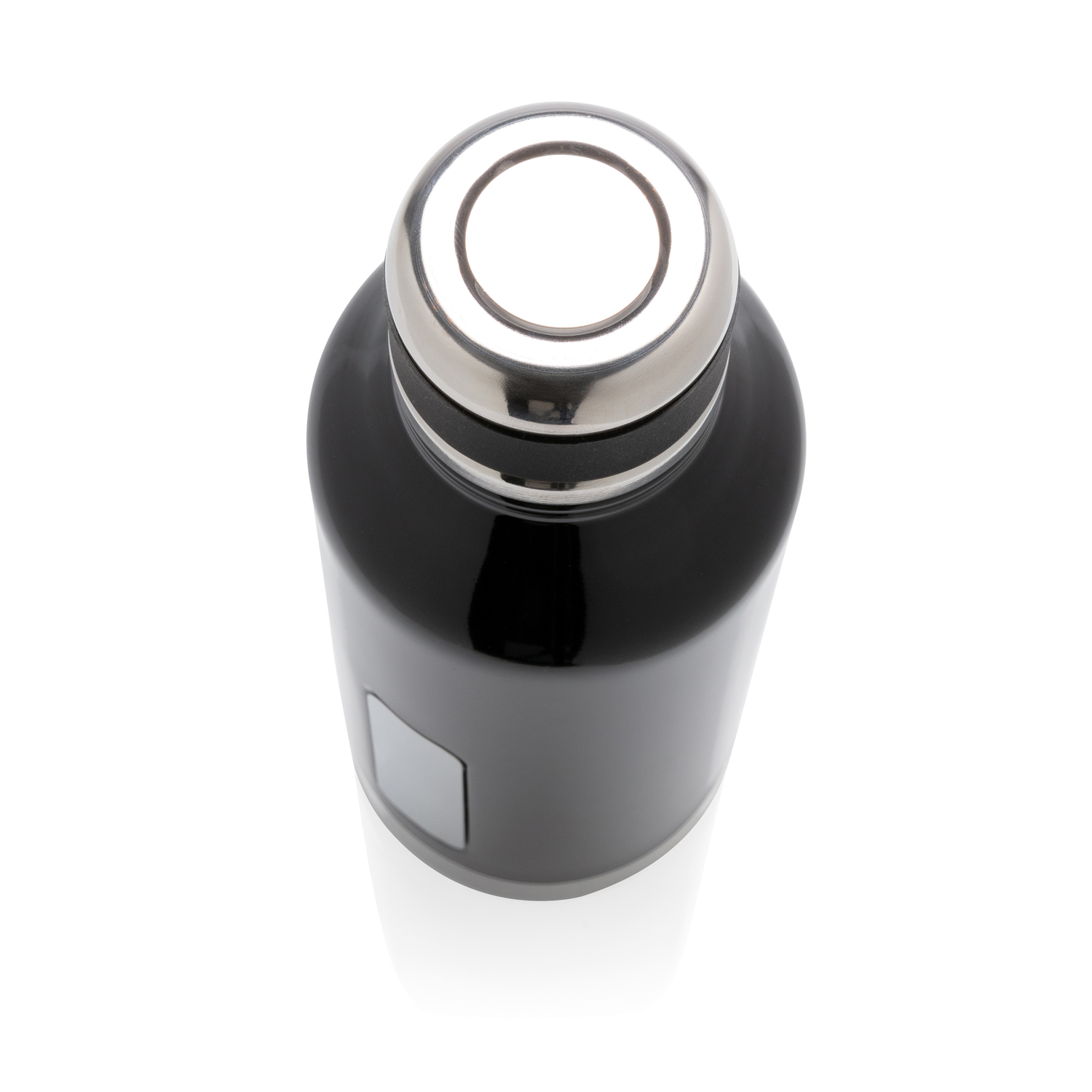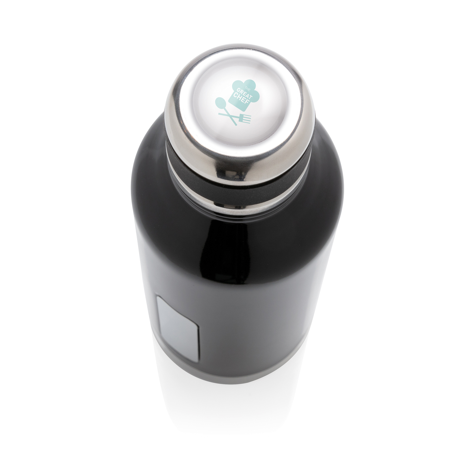 Герметичная вакуумная бутылка с закручивающейся крышкой. На лицевой стороне расположен шильдик под нанесение логотипа. Внутренняя часть из 304 нержавеющей стали и поверхность из 201 нержавеющей стали сохранят ваши напитки горячими до 5 часов и холодными до 15 часов. Объем 500 мл.