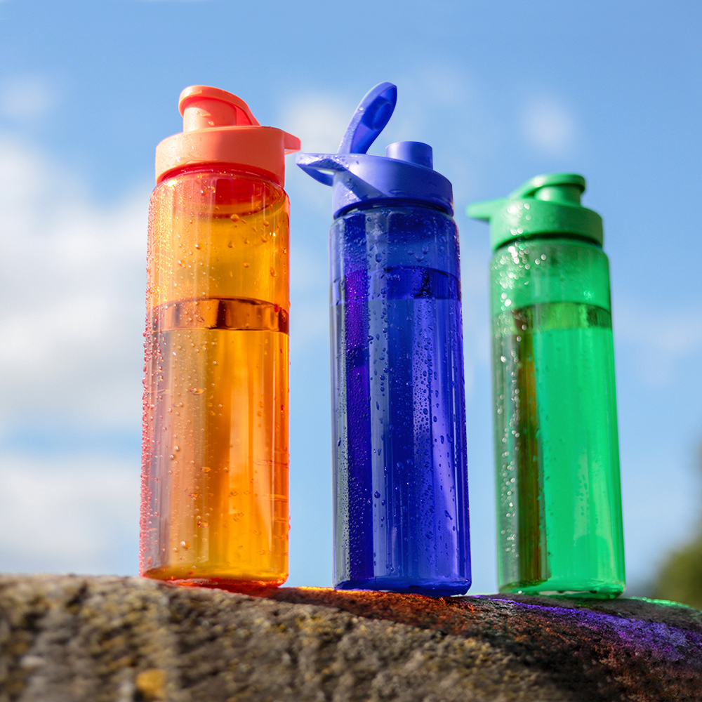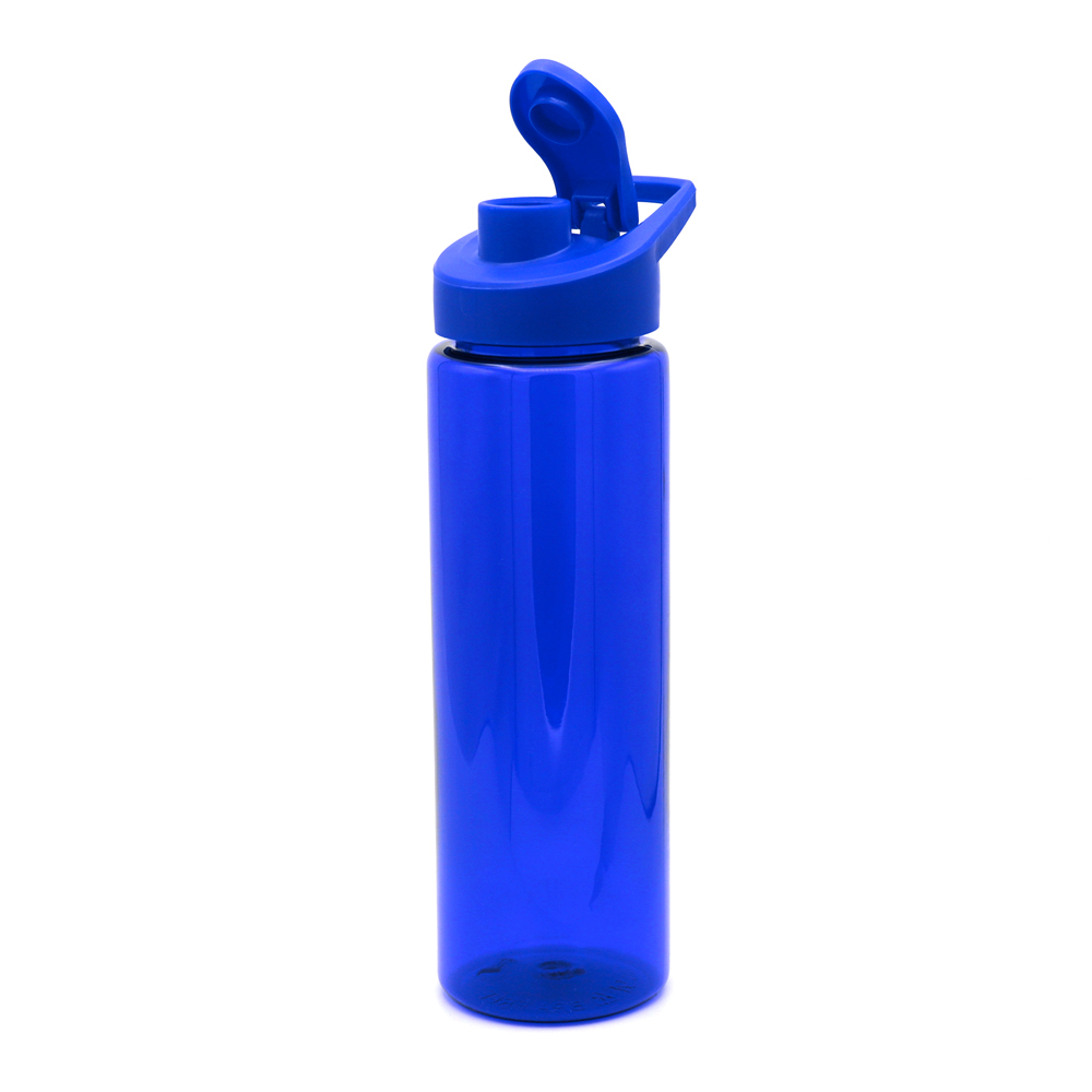 Бутылка для воды Ronny с клапаном. На крышке бутылки имеется крепление, которое позволяет закрепить бутылку на рюкзаке или на поясе. Цвет по PANTONE® (максимально приближен): 287C.- Виды нанесений: УФ-печать А2, Тампопечать большая, УФ - DTF, УФ-Лак, УФ-Цвет+Лак