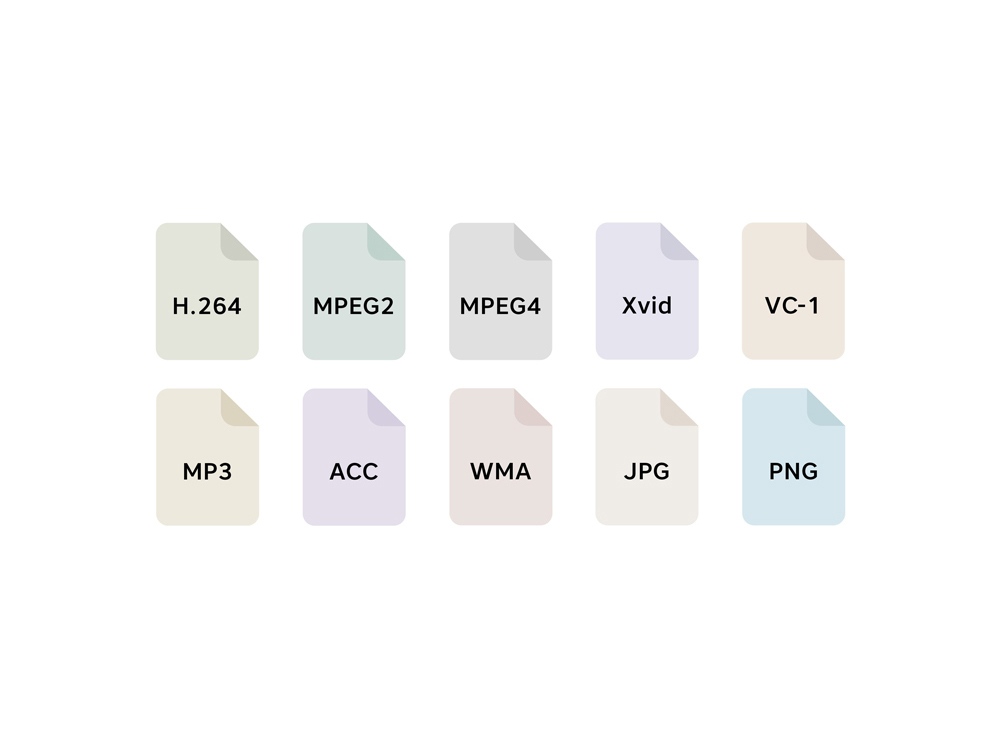 Поддержка кодеков H.264, H.265, MPEG2, MPEG4, MP3, ACC, WMA, JPG, PNG.