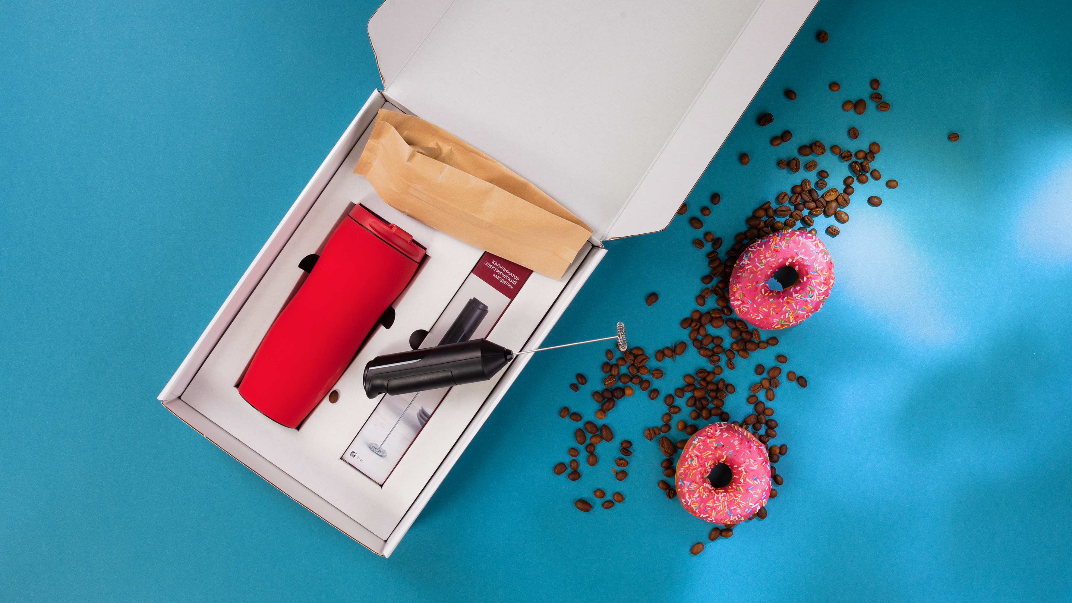 Набор, который станет приятным подарком для всех любителей кофе: зерновой кофе, термостакан и капучинатор для молока, чтобы ваш напиток получился с пенкой!