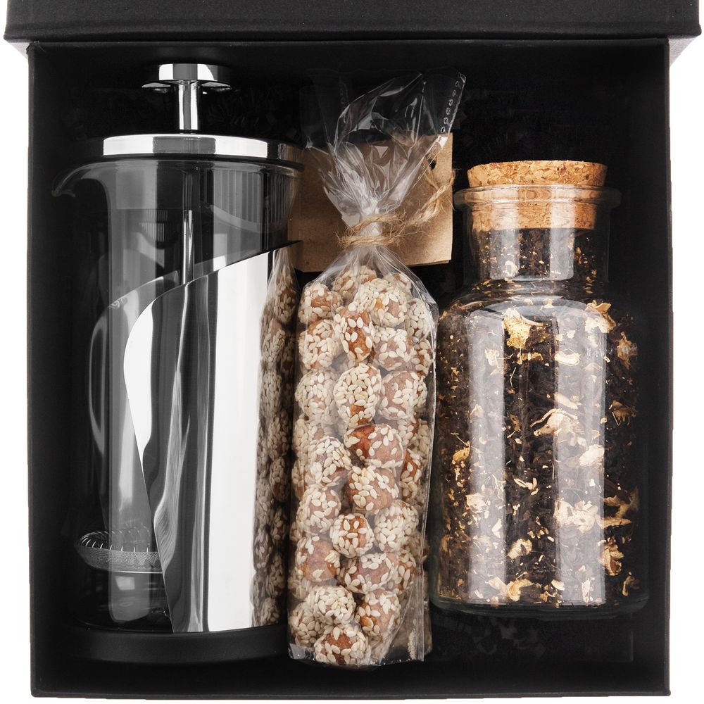 Набор Teacode — прекрасный подарок ценителям чая и всем неравнодушным к хрустящим снекам. Сладкий арахис в кунжуте, ароматный, пропитанный соком имбиря чай и френч-пресс для заваривания гарантированно обеспечат заряд энергии и хорошего настроения. А довершает композицию вкуснейшего набора стильная упаковка. -