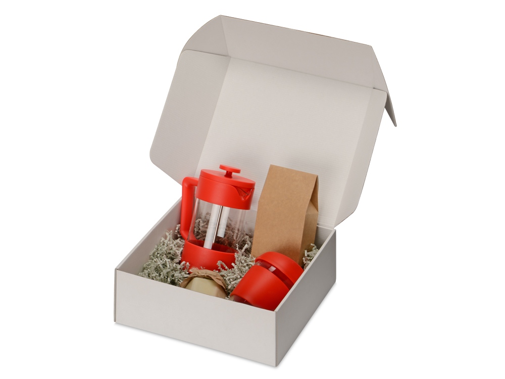 Набор Бодрое утро содержит все необходимое для действительно приятного пробуждения. В нем вы найдете все, что нужно для приготовления вашей первой чашечки кофе с утра: френч-пресс, упаковку робусты темной обжарки, стакан с силиконовыми деталями и баночку крем-меда, который составит прекрасную пару крепкому напитку. Набор упакован в белую картонную коробку и переложен бумажным наполнителем. -