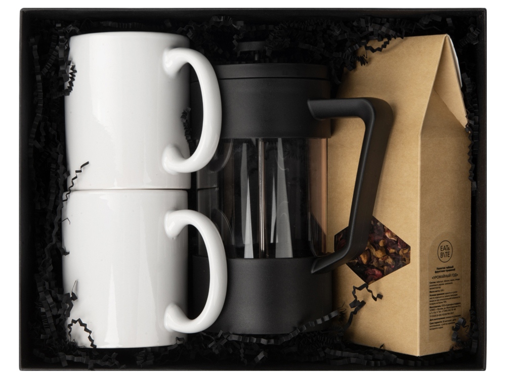 Френч-пресс и две чашки в наборе — холст, который вы можете украсить своим нанесением, превратив в настоящее произведение промоискусства.
