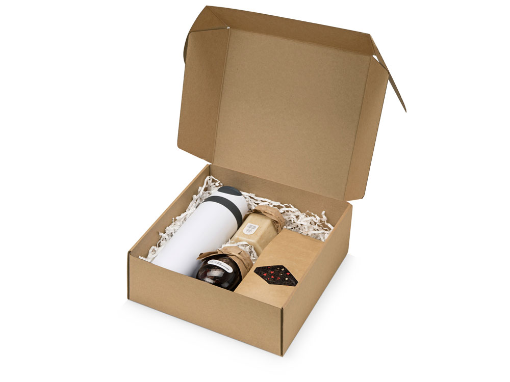 Набор состоит из термокружки, баночки крем-мёда с кокосом и миндалём, варенья из сосновых шишек, чёрного чая. Набор упакован в крафтовую картонную коробку с бумажным наполнителем. -