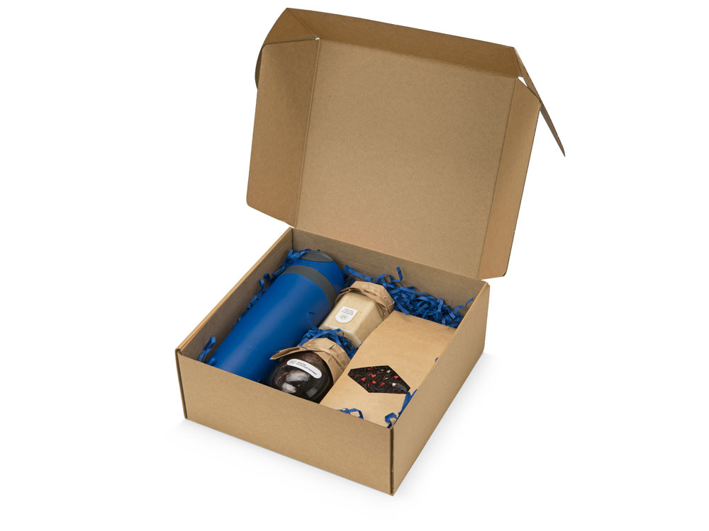 Набор состоит из термокружки, баночки крем-мёда с кокосом и миндалём, варенья из сосновых шишек, чёрного чая. Набор упакован в крафтовую картонную коробку с бумажным наполнителем. -