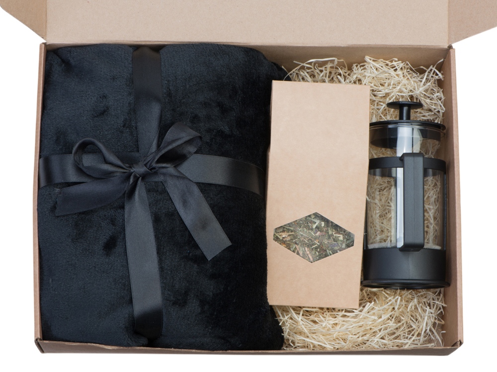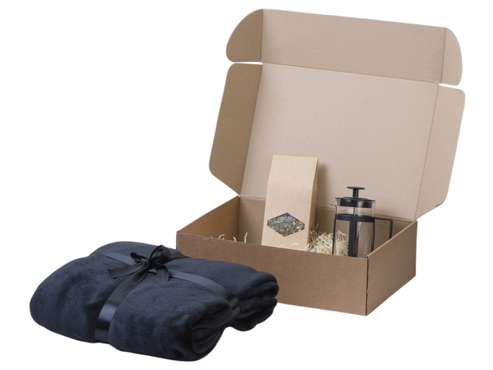 Набор продуман до мелочей. Когда зимним вечером подходит время чая, хочет завернуться в мягкий и теплый плед и наслаждаться любимым напитком, который можно заварить во френч прессе, входящем в комплект. Набор упакован в стильную крафтовую коробку. -