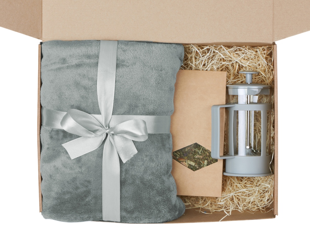Набор продуман до мелочей. Когда зимним вечером подходит время чая, хочет завернуться в мягкий и теплый плед и наслаждаться любимым напитком, который можно заварить во френч прессе, входящем в комплект. Набор упакован в стильную крафтовую коробку. -