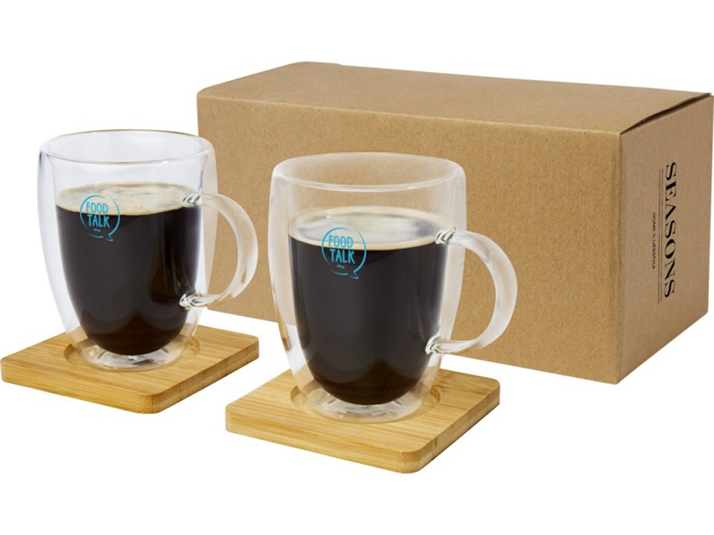 Набор из 2 термостойких стаканов с двойными стенками и бамбуковыми подставками. Бамбук взят из устойчивых, экологически и социально ответственных источников. Благодаря боросиликатному стеклу и двойным стенкам температура напитка не меняется в течение длительного времени. Объем 350 мл. Размер подставки: 10 x 10 x 1 см. -