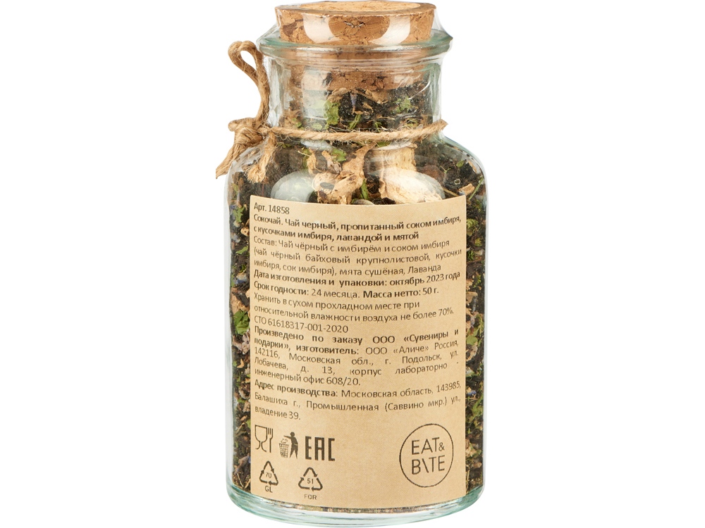 Состав: чай чёрный с имбирём и соком имбиря (чай чёрный байховый крупнолистовой, кусочки имбиря, сок имбиря), мята сушёная, Лаванда.