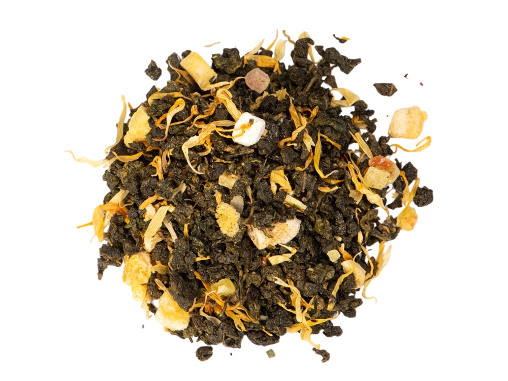 - состав: китайский чай улун Тегуаньинь, кусочки манго сублимированные, кусочки папайи, лепестки календулы, натуральный ароматизатор.;