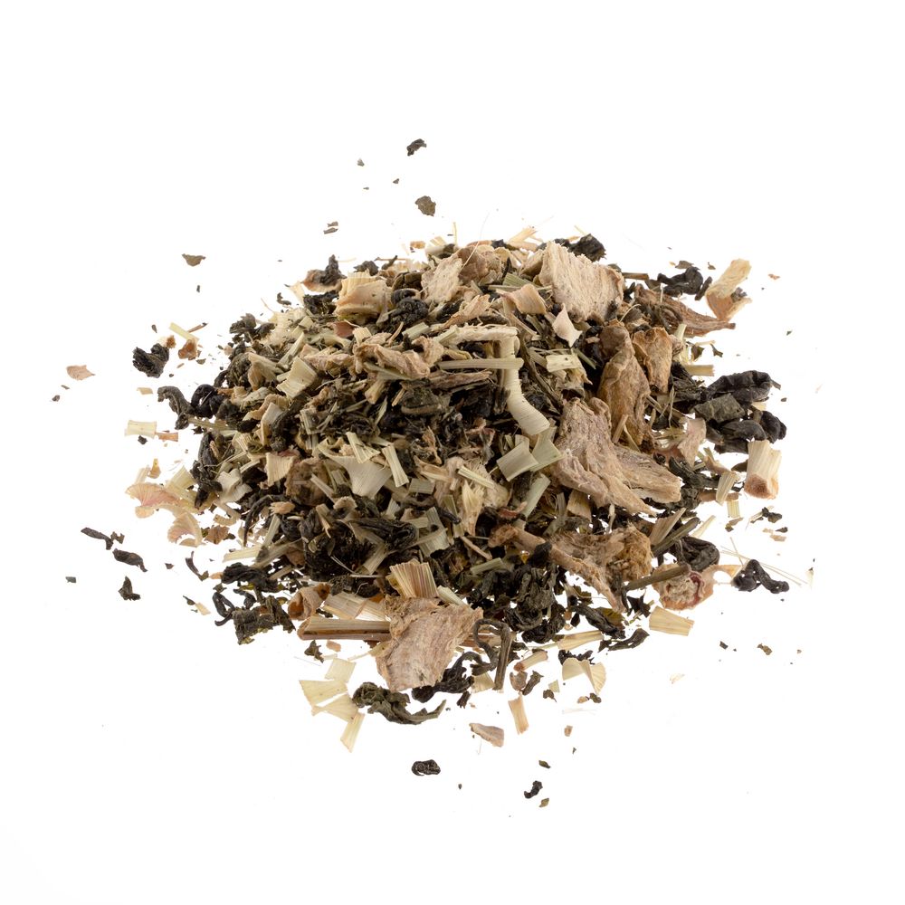 Состав: чай зеленый байховый крупнолистовой, кусочки имбиря, сок имбиря, лемонграсс.