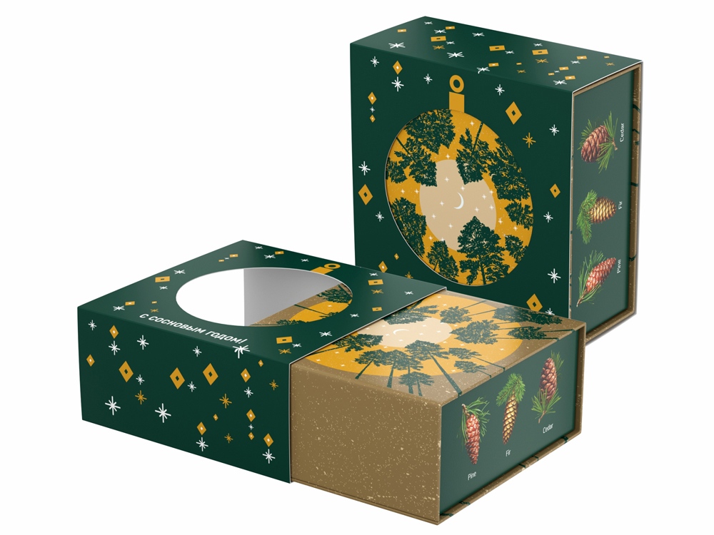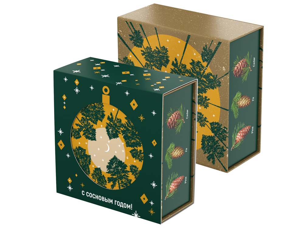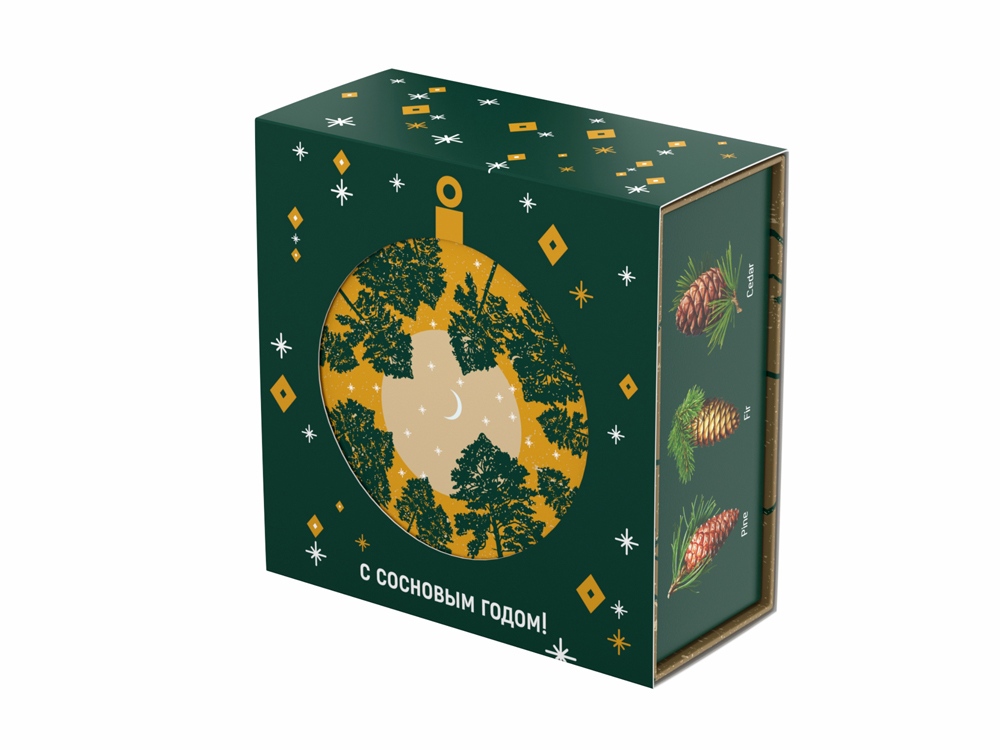 Аромат и вид хвои – символ Рождества и Нового года. Хвойная шкатулка С сосновым годом! оформлена праздничным паттерном и изображением шишек разных хвойных деревьев. На крышке шкатулки помещена иллюстрация, изображающая вид снизу вверх на звёздное небо и уходящие ввысь сосны. При надевании на шкатулку шубера (суперобложки) с круглым отверстием, на крышке шкатулки появляется вырубное изображение новогоднего шарика.