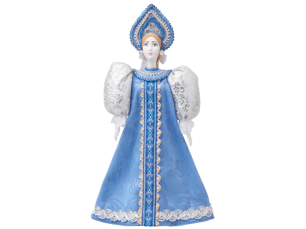 - Фарфоровая кукла в народном костюме: ручная работа, украшенная детализированным голубым сарафаном, воздушными белыми рукавами и нарядным кокошником с узорами. Кукла воплощает эстетику старинных русских праздников.