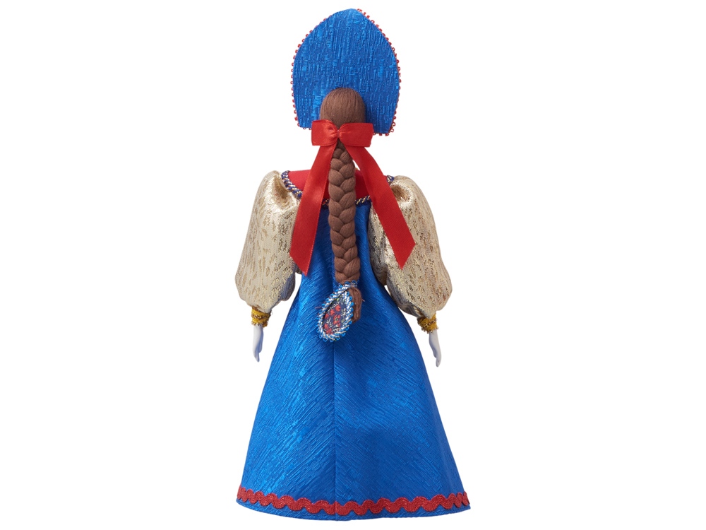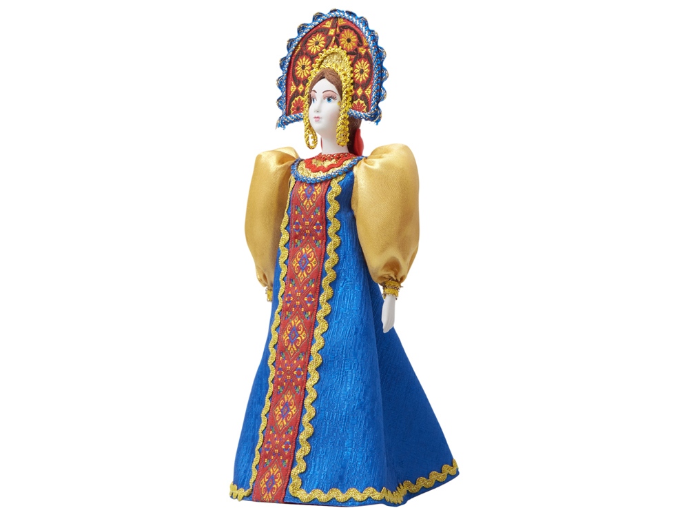 - Куклу ручной работы: сувенирная фарфоровая кукла в традиционном девичьем праздничном костюме. Яркий сарафан синего цвета, пышные рукава и кокошник с богатым декором отражают подлинный облик русского народного наряда.