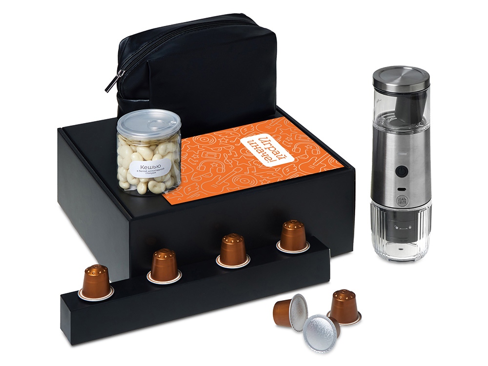 Набор Re:y. Boost о бодрости, энергии и маленьких ритуалах, которые можно взять с собой. Портативная кофемашина и кофе в капсулах позволяют приготовить ароматный напиток дома, в офисе или на прогулке. Кешью в глазури добавляет сладкую нотку, а косметичка позволяет взять любимые вещи с собой, куда бы вы ни отправились.. Этот набор превращает привычный утренний ритуал в момент бодрости и комфорта, где бы вы ни были. -