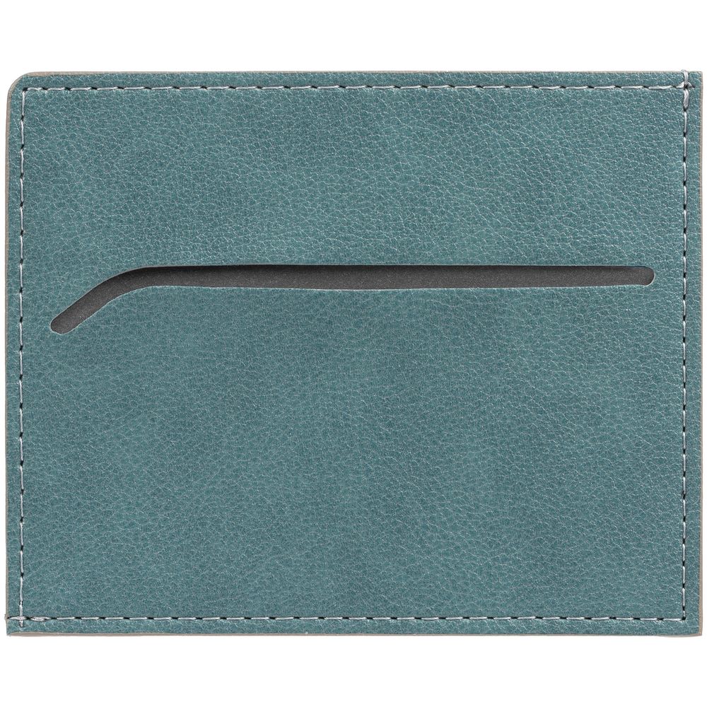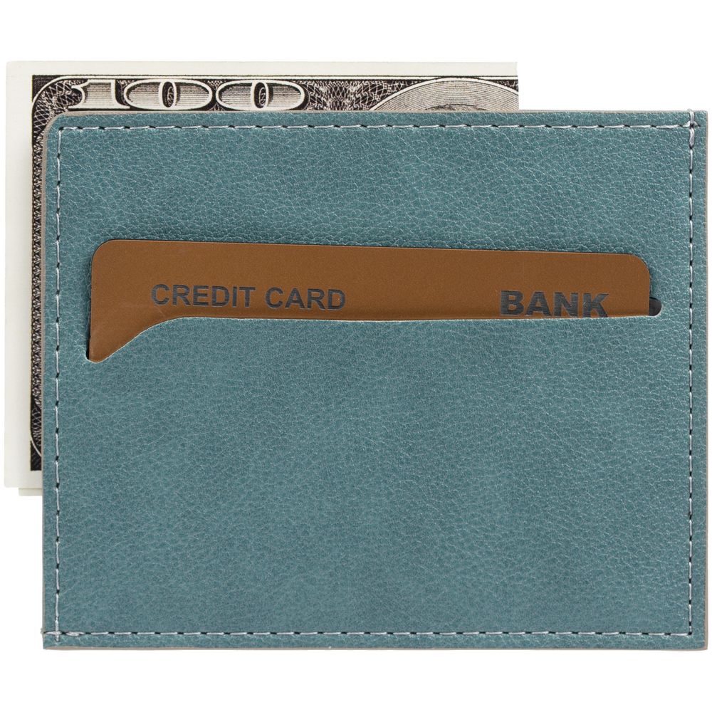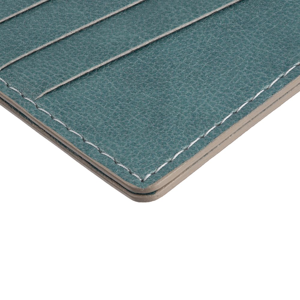 Чехол выполнен из материала Petrus, голубой JJ, дополнен окрашенным срезом края и внутренним карманом из серого картона. Имеет 4 отделения для кредитных карт и 1 отделение для купюр. -