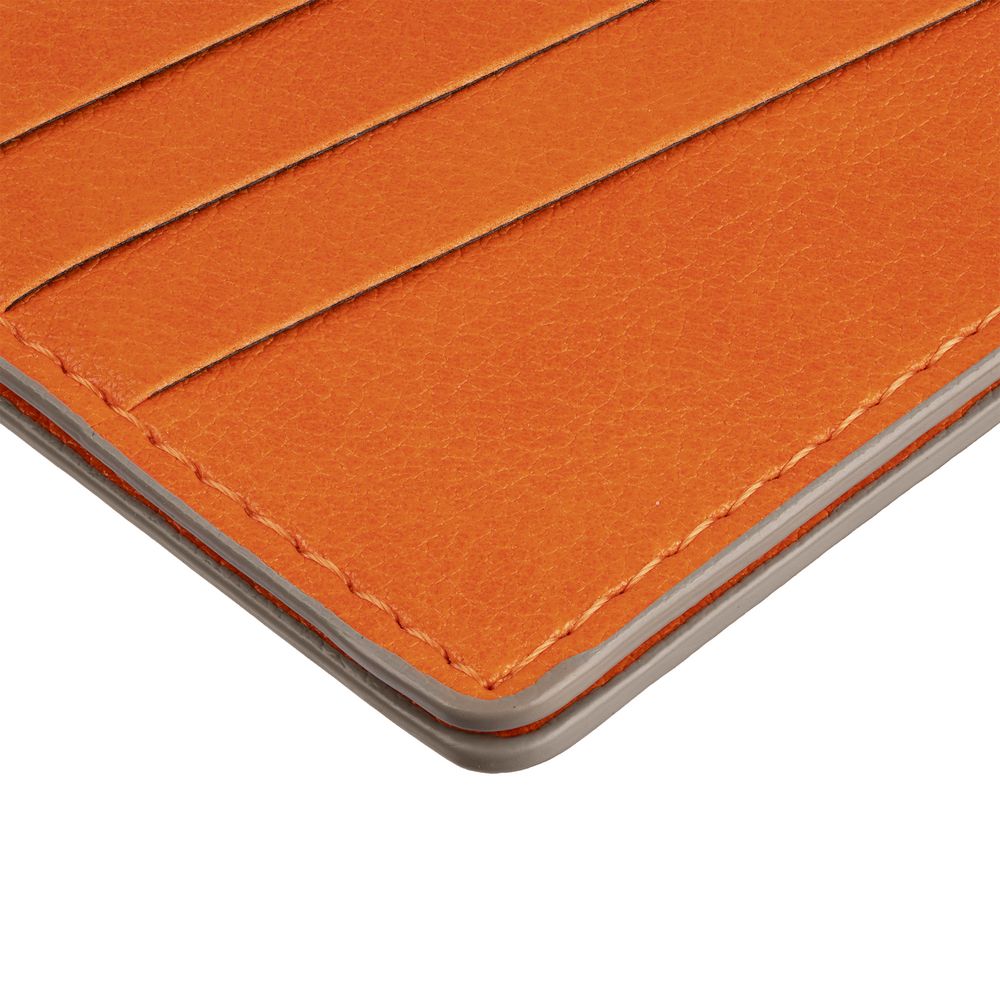 Чехол выполнен из материала Petrus, оранжевый ОО, дополнен окрашенным срезом края и внутренним карманом из серого картона.