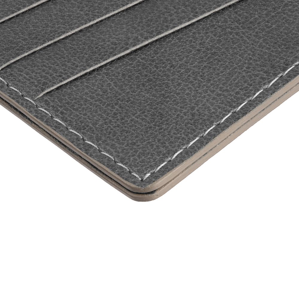 Чехол выполнен из материала Petrus, серый СС, дополнен окрашенным срезом края и внутренним карманом из серого картона. Имеет 4 отделения для кредитных карт и 1 отделение для купюр. -