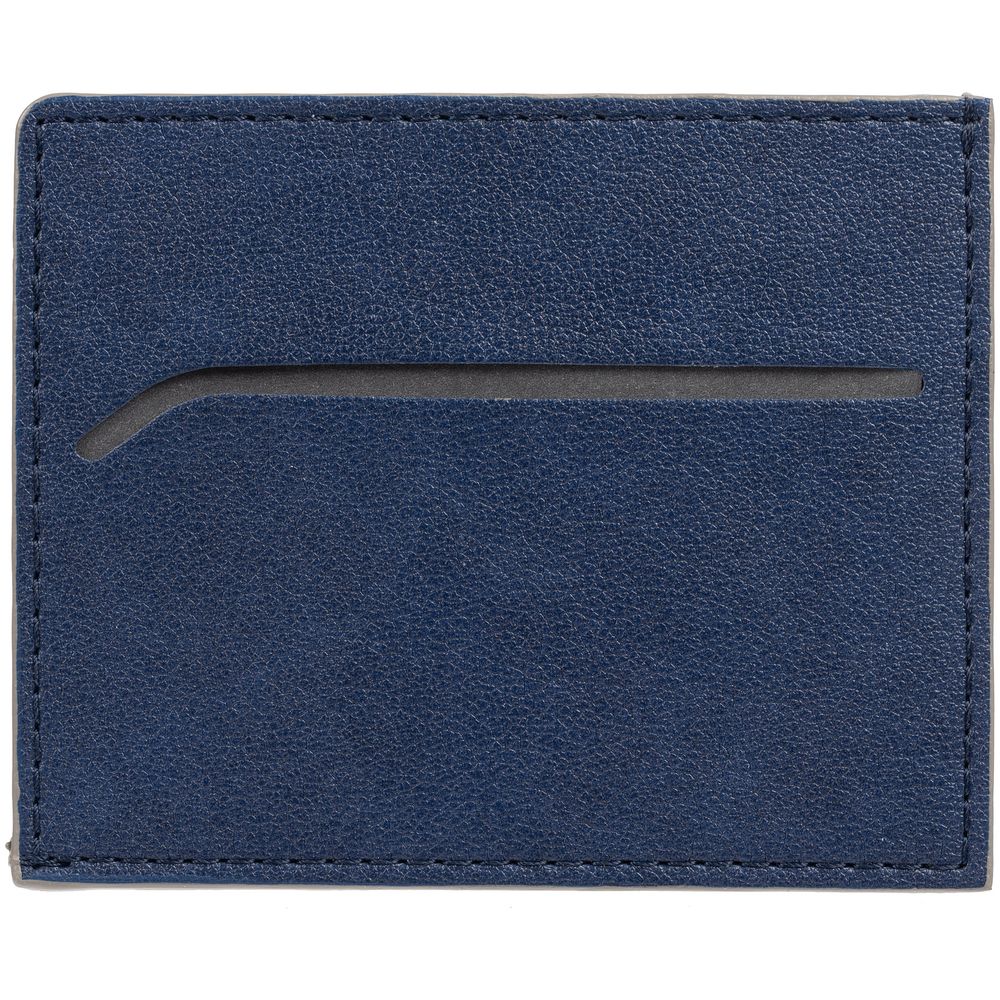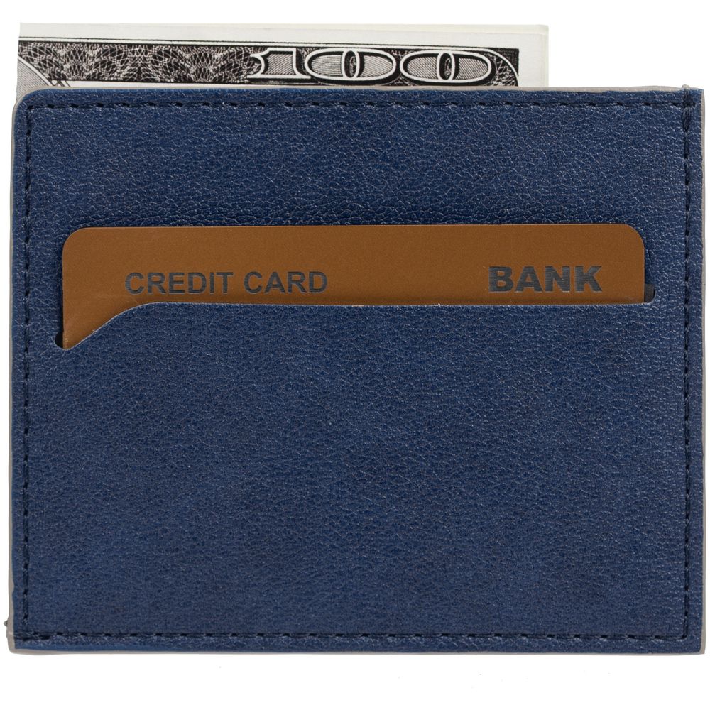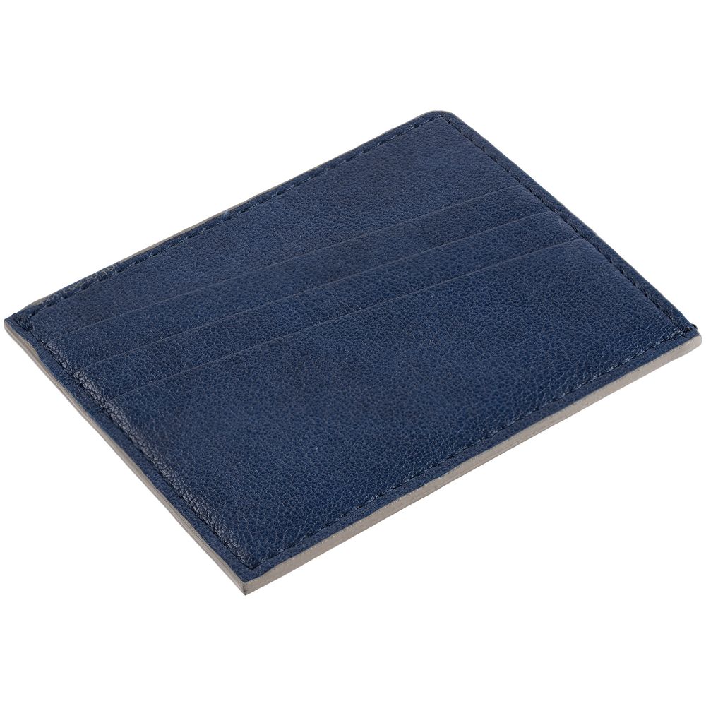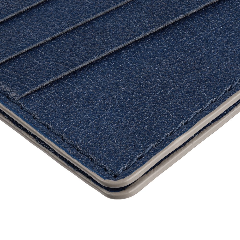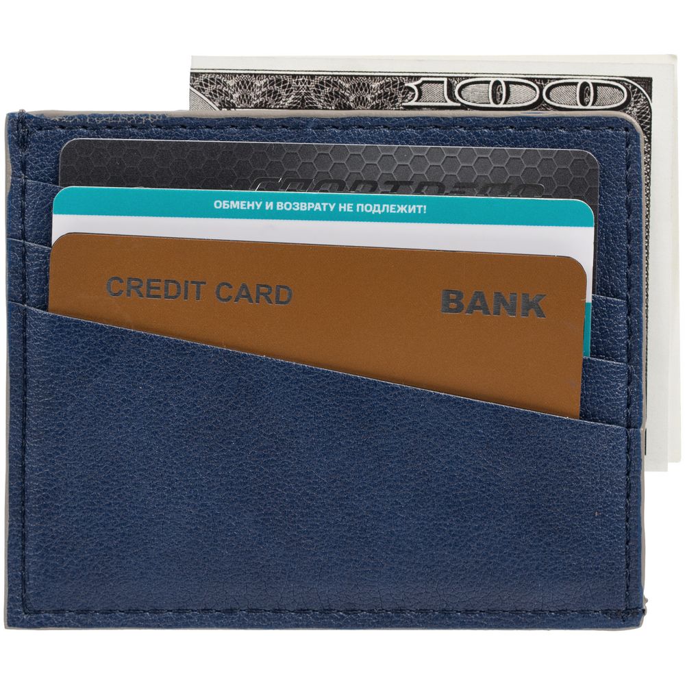Чехол выполнен из материала Petrus, синий НН, дополнен окрашенным срезом края и внутренним карманом из серого картона. Имеет 4 отделения для кредитных карт и 1 отделение для купюр. -