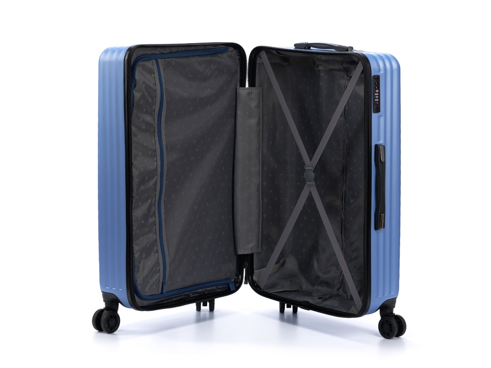 Чемодан полностью раскрывается на 2 вместительных отделения, с перегородкой на молнии и ремнями в форме X для надежной фиксации вещей на месте.