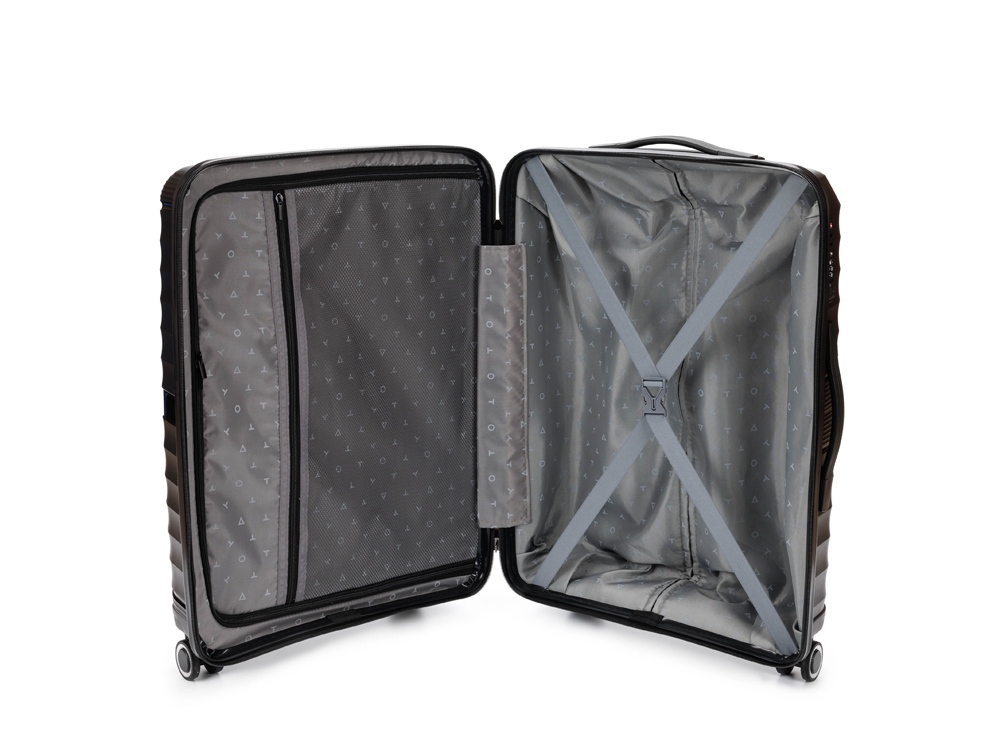 Чемодан полностью раскрывается на 2 вместительных отделения, с перегородкой на молнии и ремнями в форме Y для надежной фиксации вещей на месте.