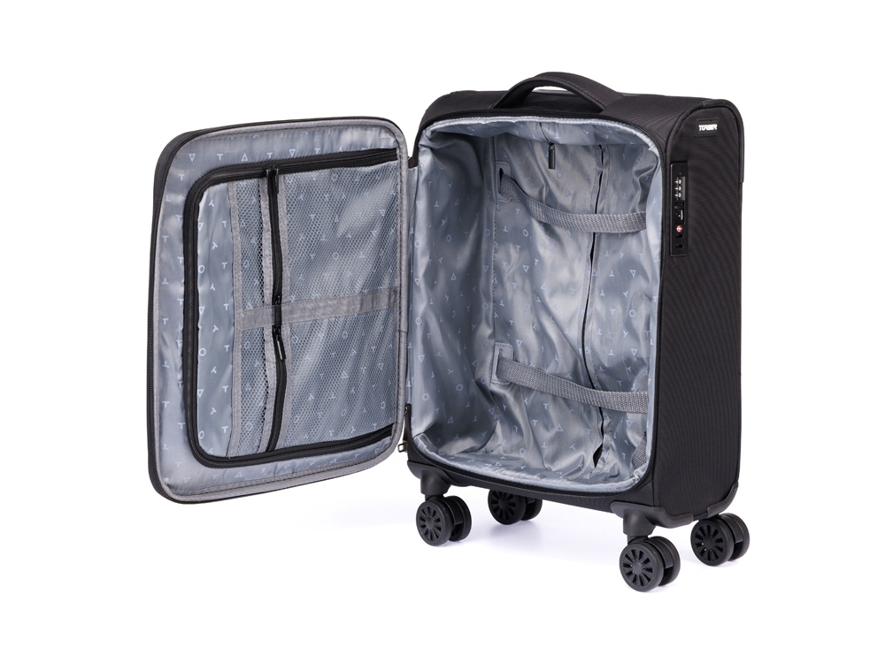 Чемодан полностью раскрывается на 2 отделения, с перегородкой на молнии и ремнями для надежной фиксации вещей на месте.