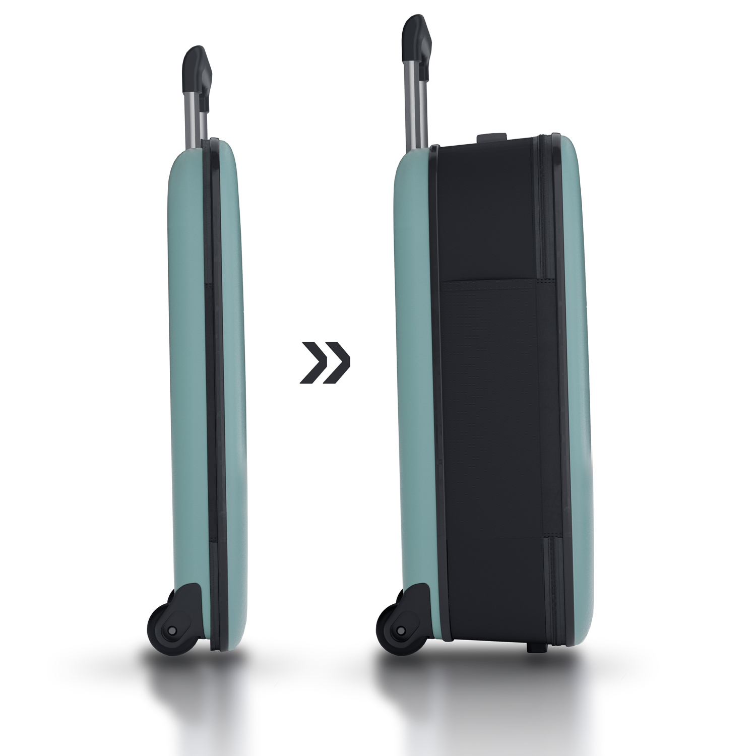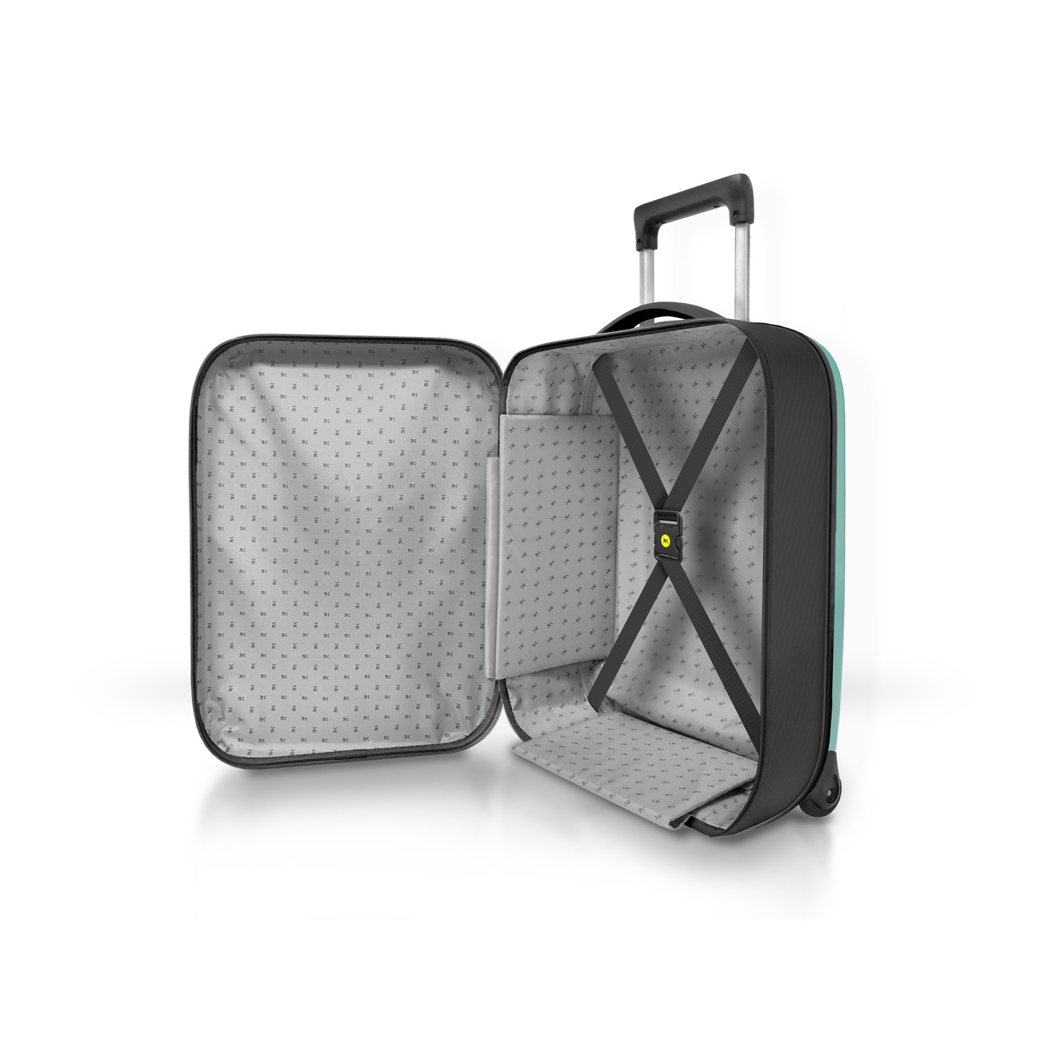 Складной легкий чемодан Rollink Vega II бирюзового цвета. Размер 55х40х20 см. В сложенном виде толщина составляет 5 см, с колёсами 8,5 см. Объем 40 л. Вес 2,4 кг. Жесткие стенки сделаны из поликарбоната повышенной ударопрочности. Бока мягкие, из темно-серого плотного полиэстера с высокой водоотталкивающей способностью. Чемодан уверенно стоит вертикально даже в сложенном состоянии. Внутри три откидывающихся жестких клапана на дне и боках чемодана, крепятся липучками и сохраняют форму чемодана в собранном виде. Эластичная Х-образная стяжка для фиксации предметов внутри чемодана. Боковой easy access карман 12х18,5 см на липучке для документов и телефона. Удлиненная надежная выдвижная телескопическая ручка из алюминия с несколькими уровнями фиксации высоты ручки (от пола 88/96/104 см) для людей разного роста и удобная мягкая ручка сверху чемодана, чтобы было удобно нести его в руках. 2 колеса со специальным покрытием и подшипниками для более плавного и бесшумного передвижения. Высококачественная молния черного цвета. В комплект входит эластичная стяжка для фиксации чемодана в сложенном состоянии.