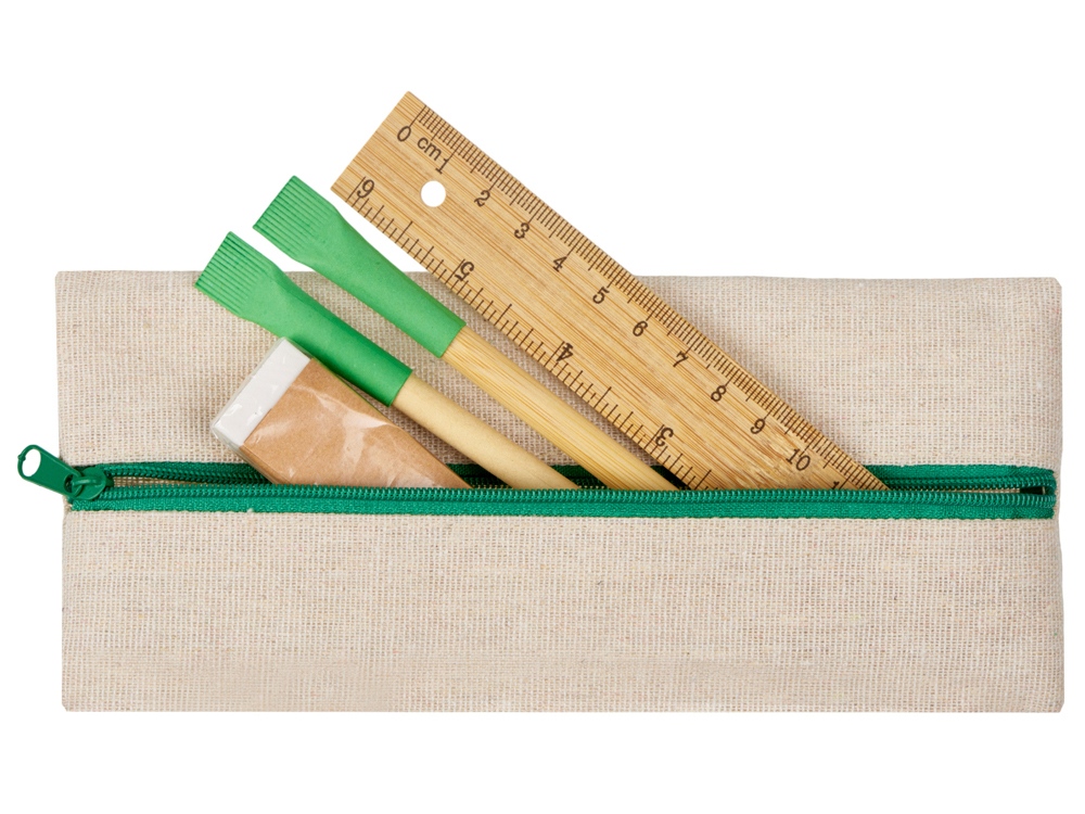 Удобный набор канцелярии со всем необходимым. В наборе: пенал на молнии, ручка Recycled, вечный карандаш в бамбуковом корпусе с колпачком из переработанной бумаги, ластик и бамбуковая линейка. Чтобы все самые необходимые пишущие принадлежности были под рукой. -