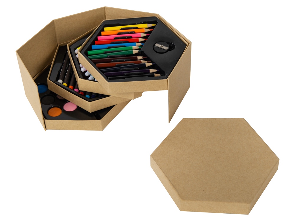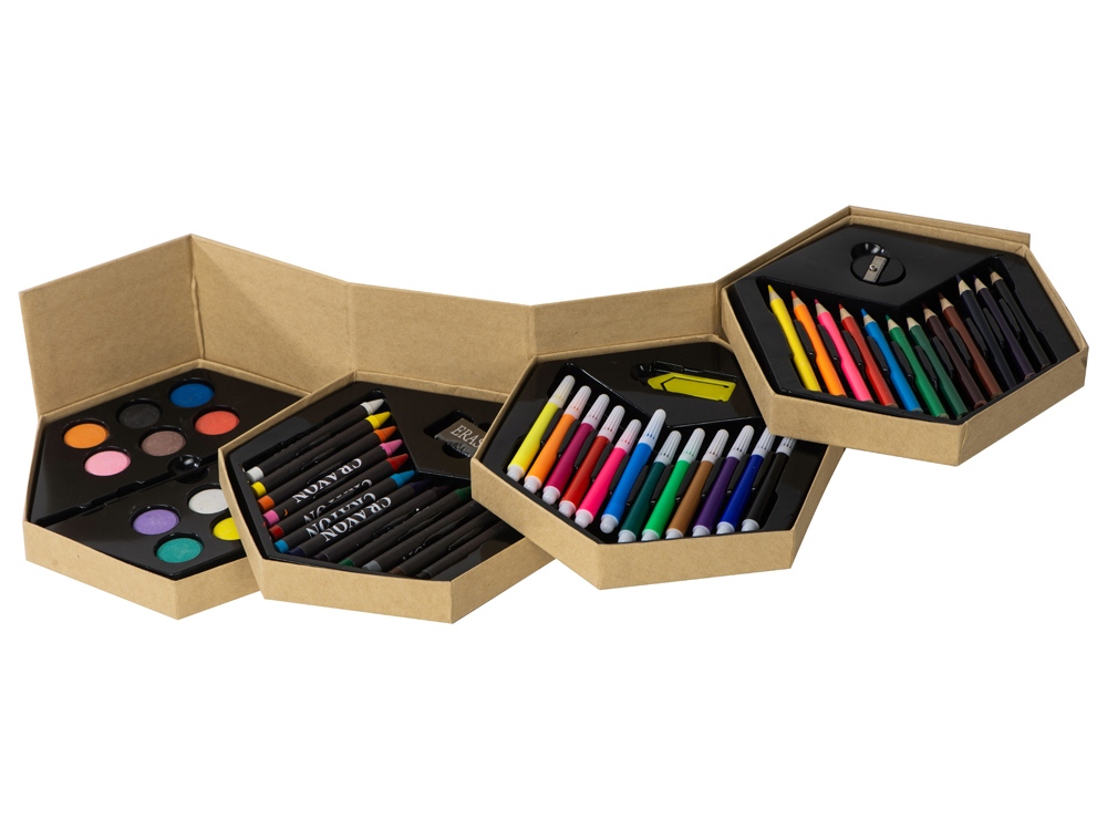 Набор из 52 предметов для рисования. 12 маркеров, 12 цветных карандашей, 12 восковых карандашей, 12 акварельных красок, кисточка, точилка, резинка и большая скрепка. -
