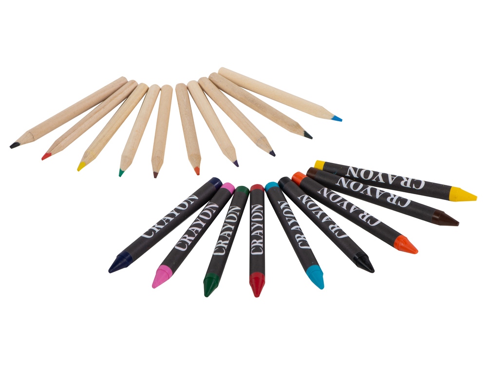 Набор из 19 карандашей. 9 цветных восковых карандашей и 10 цветных карандашей в картонной коробке с пластиковым окошком. -