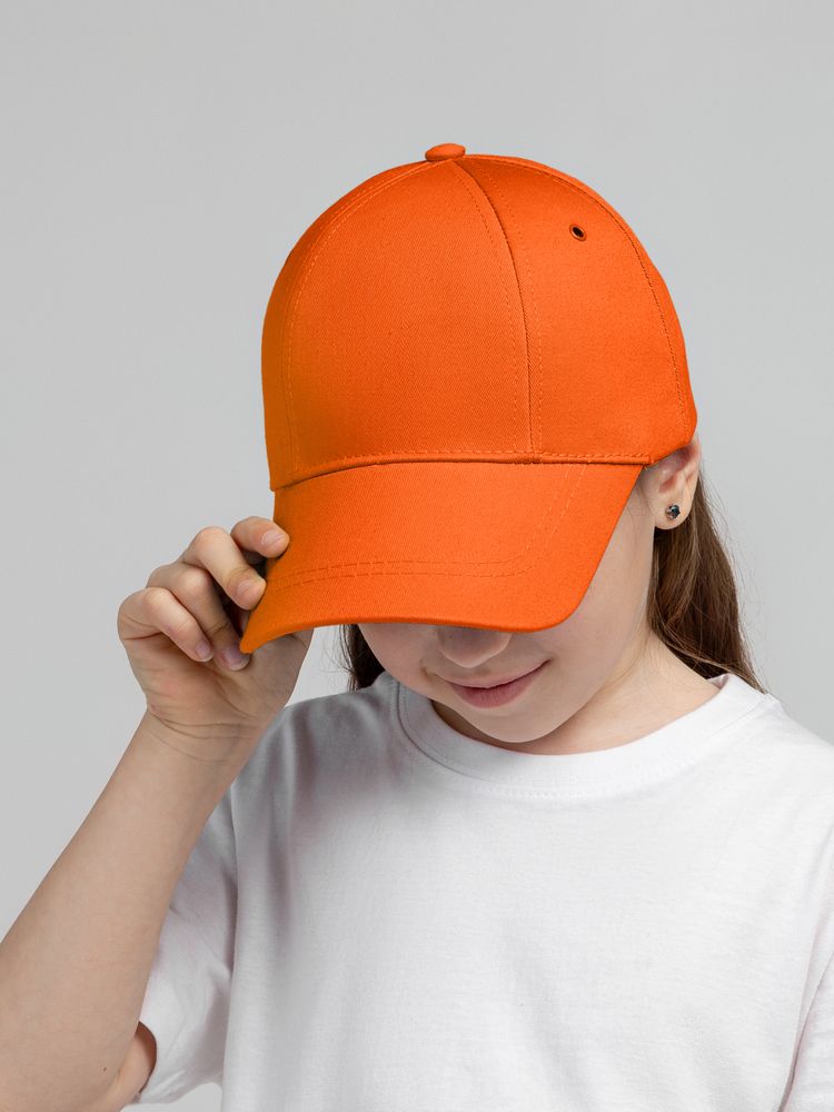 Детская модель с шестью клиньями без шва на лбу. Металлические люверсы покрашены в тон изделия. Сзади металлическая застежка для регулировки размера. -