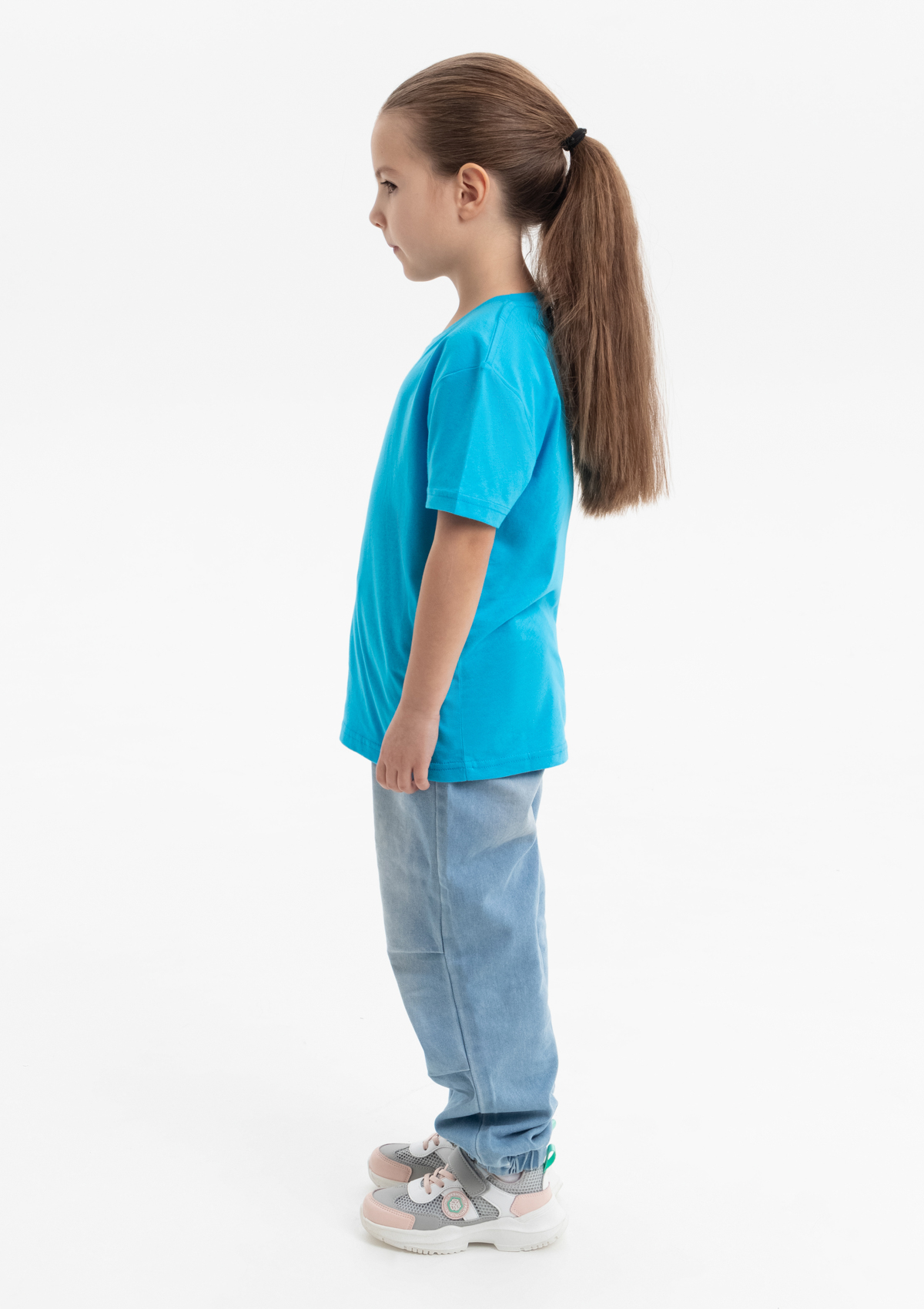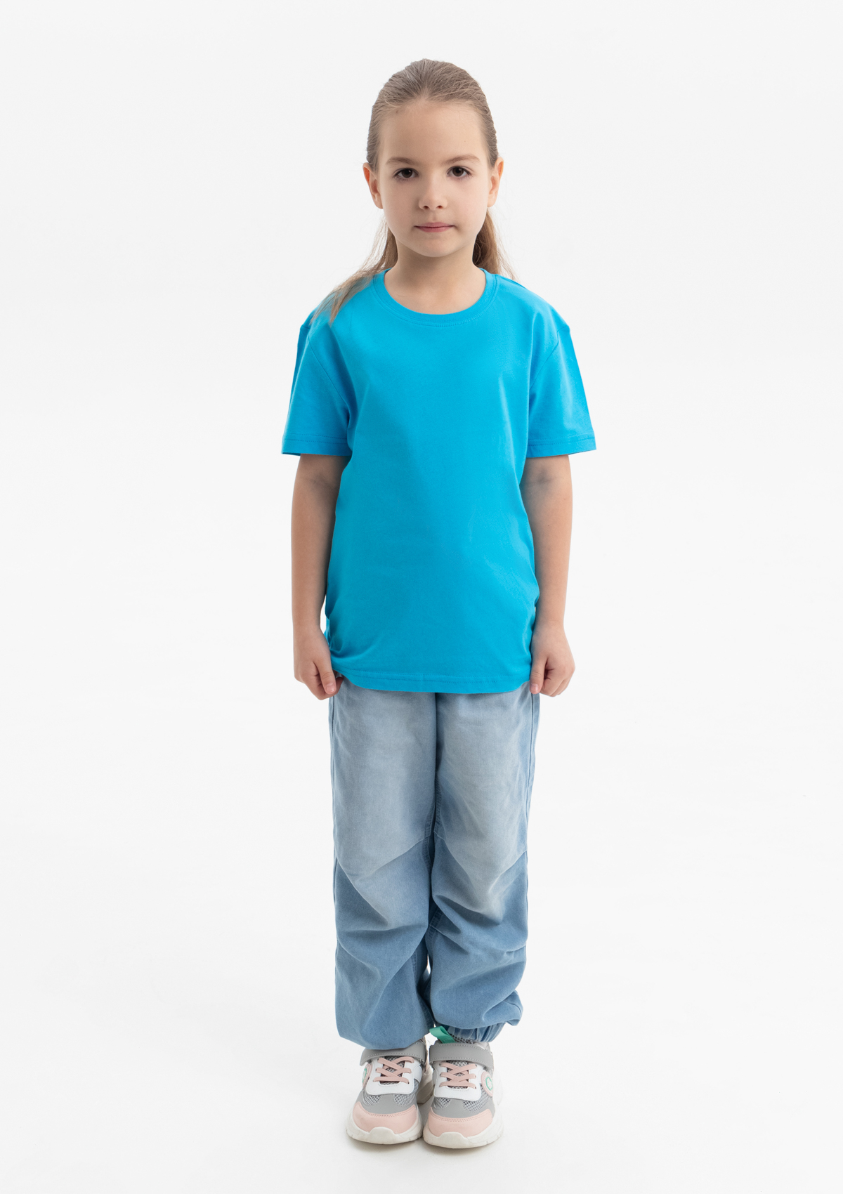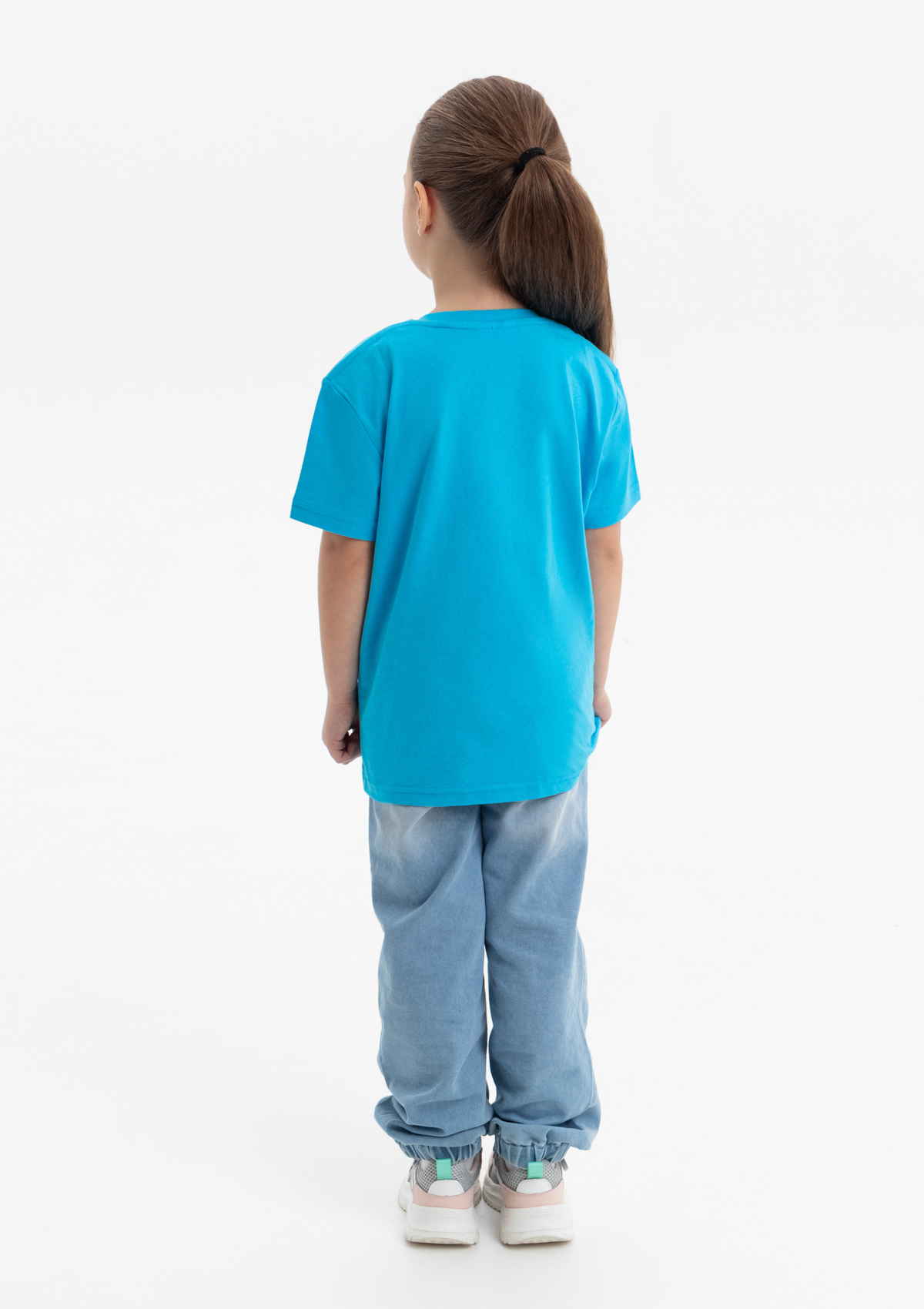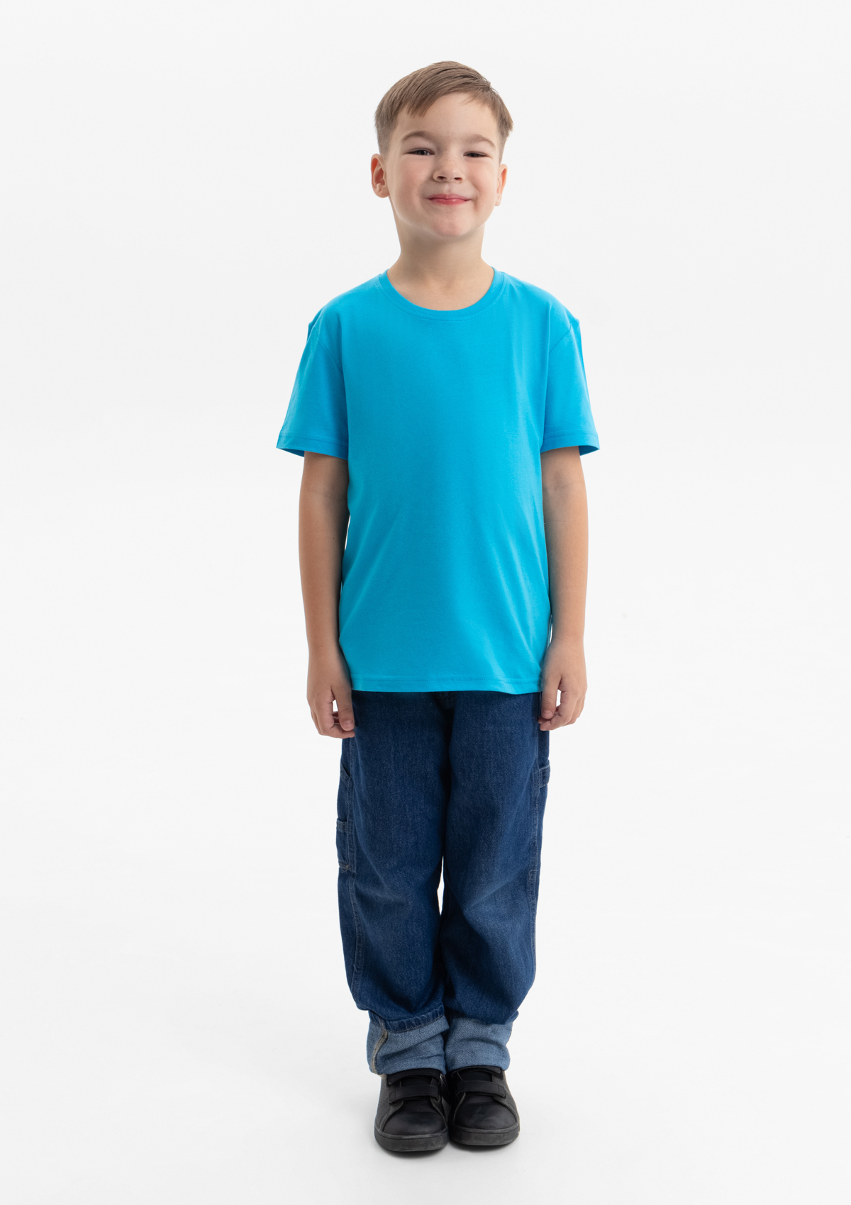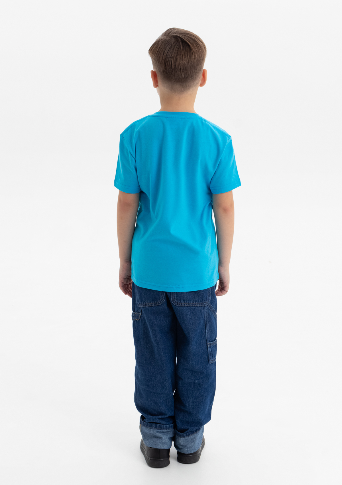 Детская футболка свободного силуэта с округлым воротом и втачным рукавом. Плечевые швы и шов горловины спинки усилены настрочной бейкой из основного полотна.