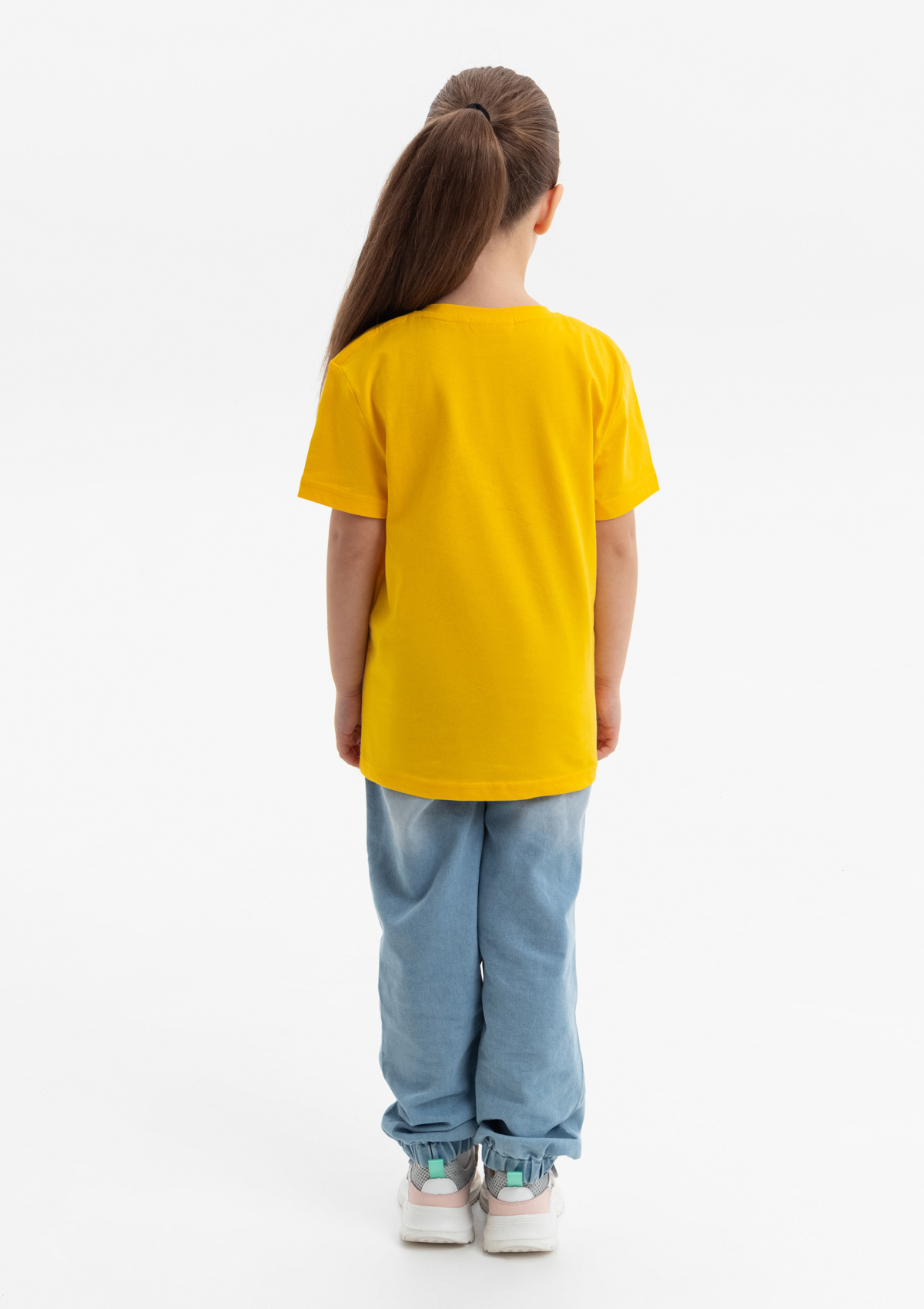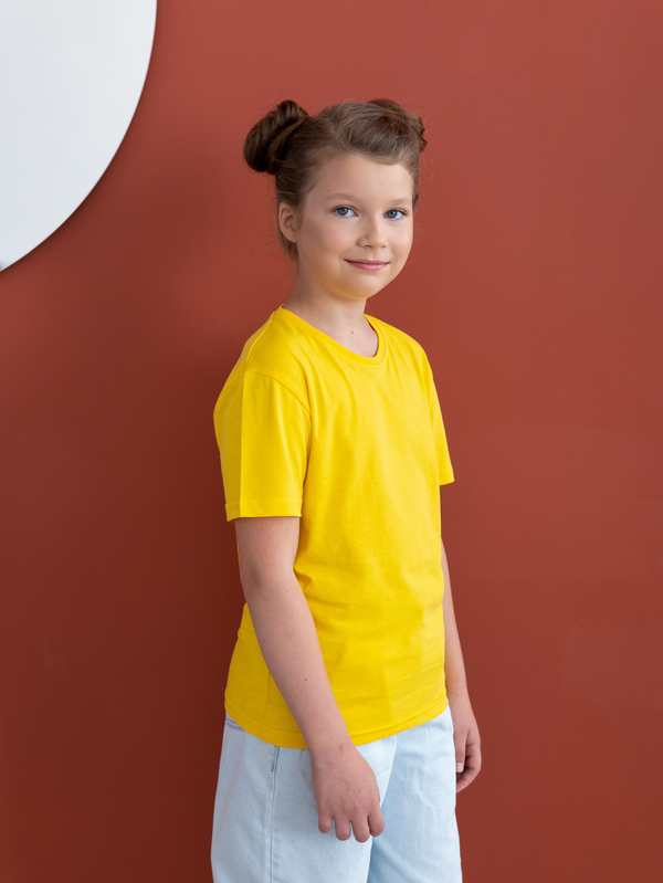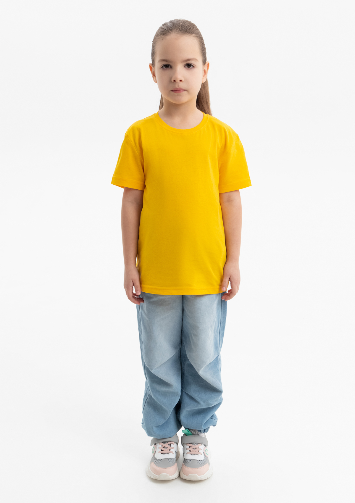 Детская футболка свободного силуэта с округлым воротом и втачным рукавом. Плечевые швы и шов горловины спинки усилены настрочной бейкой из основного полотна.