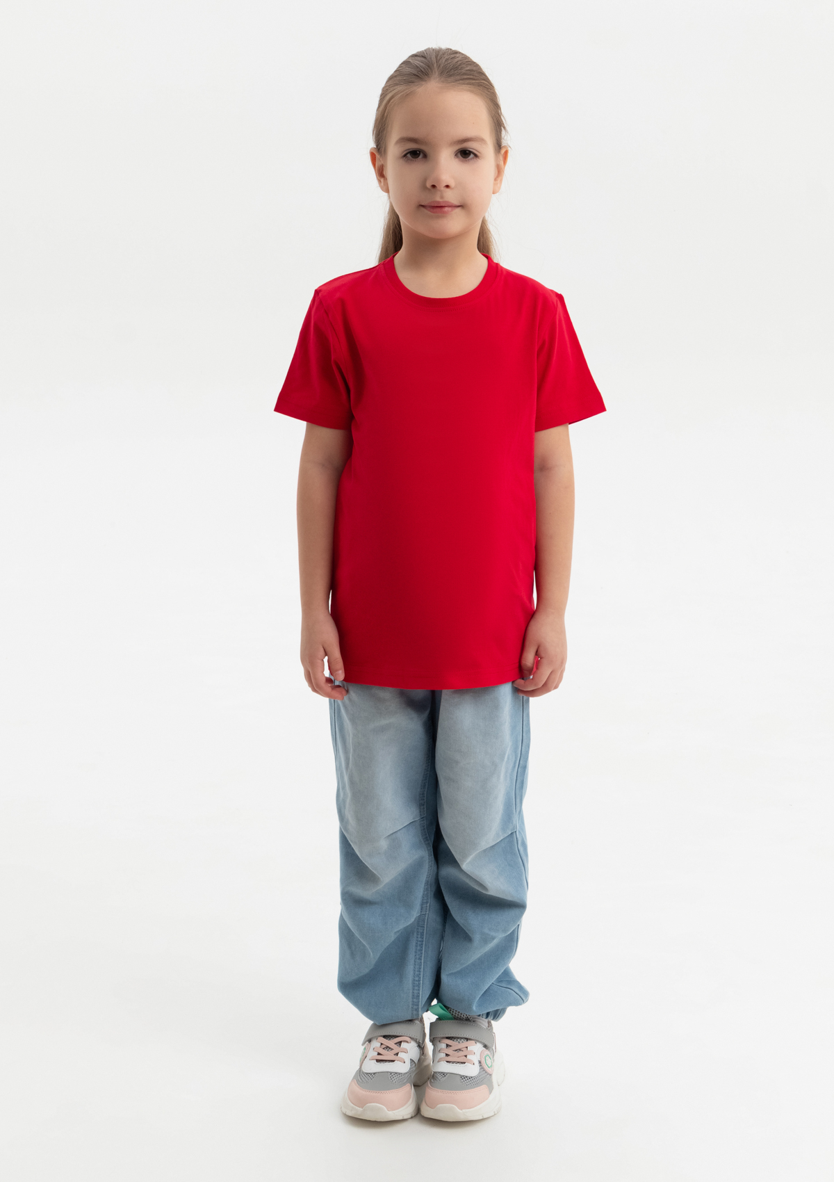 Детская футболка свободного силуэта с округлым воротом и втачным рукавом. Плечевые швы и шов горловины спинки усилены настрочной бейкой из основного полотна.