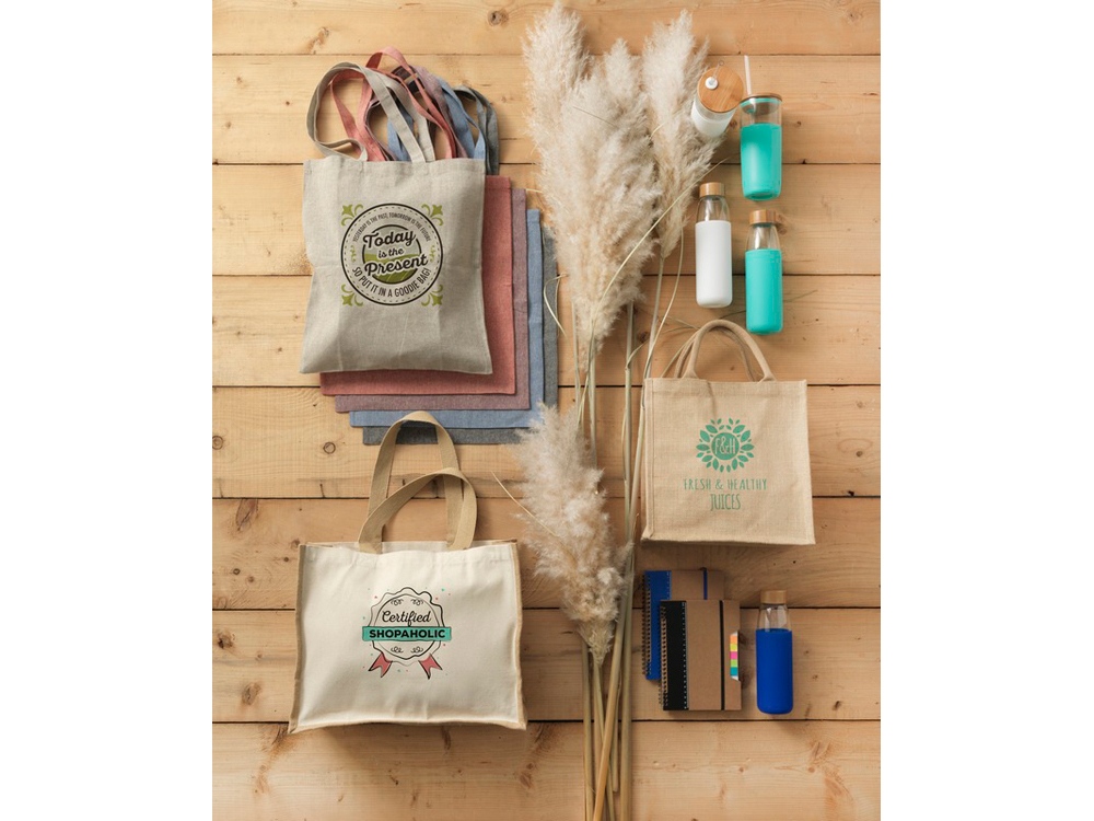 Джутовая подарочная сумка Chennai. Джутовая сумка с ламинированным открытым основным отделением и вставкой. Хлопковые ручки высотой 11,5 см. Джут. -