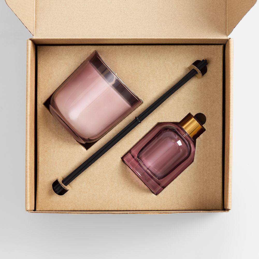 флакон, подсвечник - стекло, палочки из файбера; свеча - воск; коробка - микрогофрокартон, плотность 385 г/кв.м