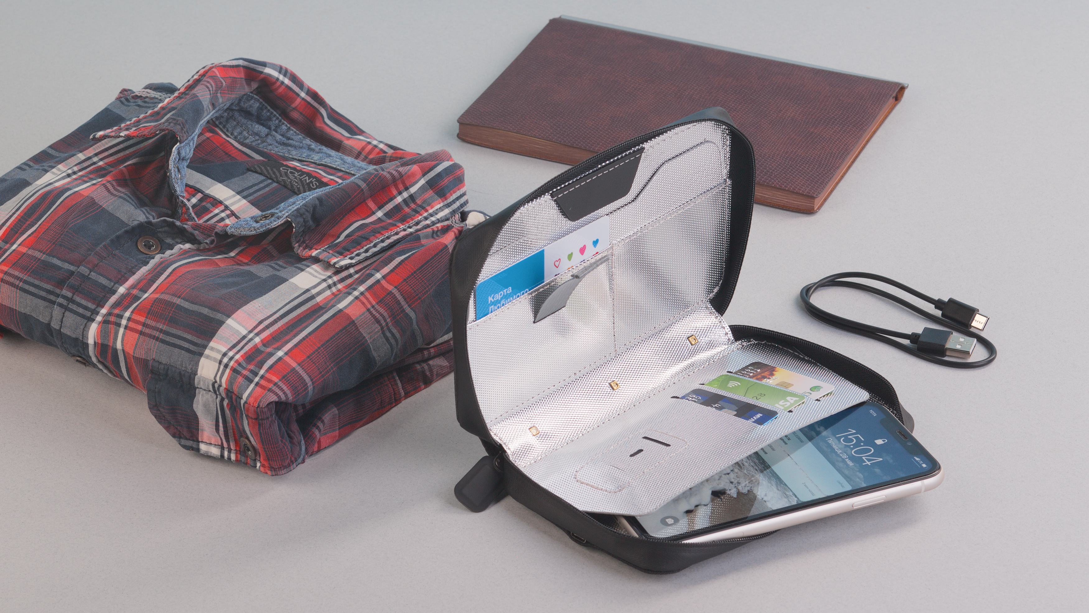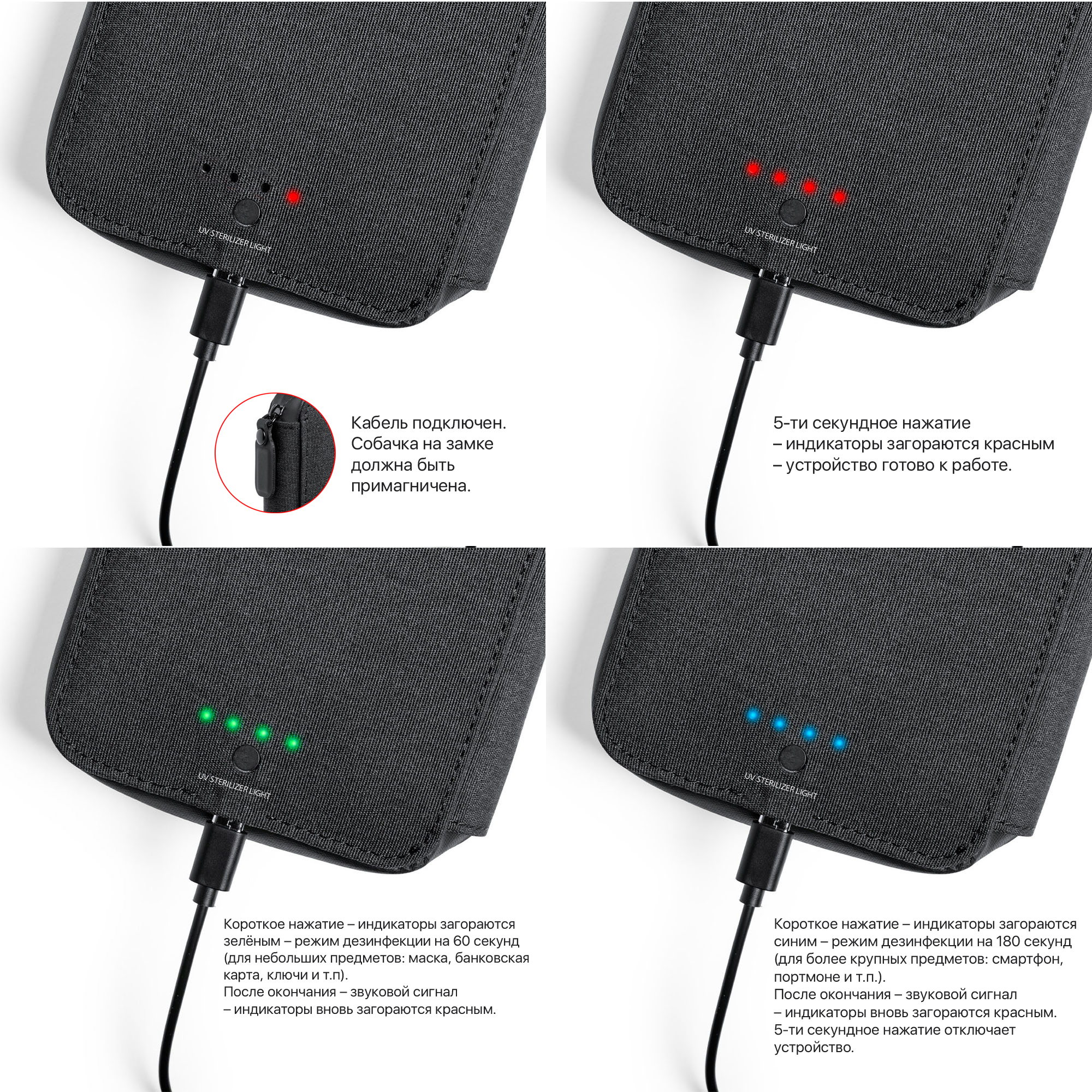 Органайзер с функцией УФ(UV)-стерилизации позволяет эффективно проводить обработку поверхности смартфона, банковских карт, денежных купюр и всевозможных аксессуаров, размещённых во внутреннем отделении.